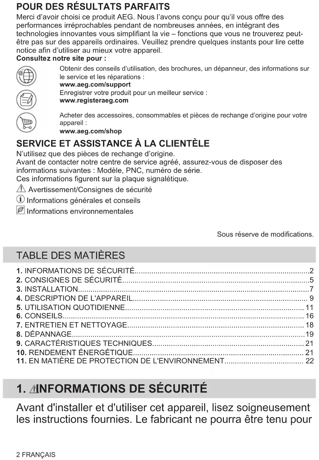 Merci d’avoir choisi ce produit AEG. Nous l’avons conçu pour qu’il vous offre des performances irréprochables pendant de nombreuses années, en intégrant des technologies innovantes vous simplifiant la vie – fonctions que vous ne trouverez peut- être pas sur des appareils ordinaires. Veuillez prendre quelques instants pour lire cette notice afin d’utiliser au mieux votre appareil. Consultez notre site pour :Obtenir des conseils d’utilisation, des brochures, un dépanneur, des informations surle service et les réparations :www.aeg.com/supportEnregistrer votre produit pour un meilleur service :www.registeraeg.comAcheter des accessoires, consommables et pièces de rechange d’origine pour votreappareil :www.aeg.com/shop