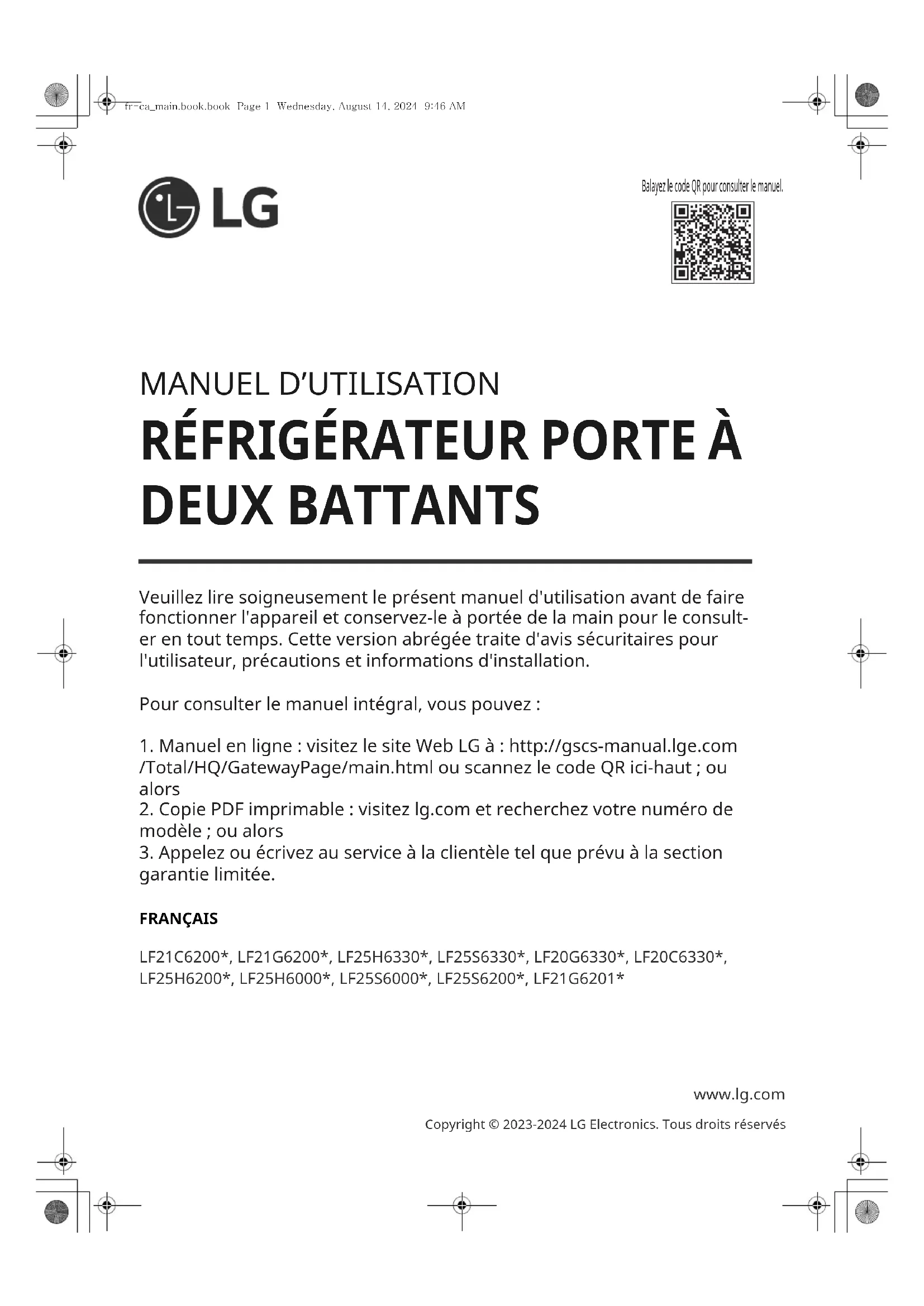 DEUX BATTANTS FRANÇAIS LF21C6200*, LF21G6200*, LF25H6330*, LF25S6330*, LF20G6330*, LF20C6330*, LF25H6200*, LF25H6000*, LF25S6000*, LF25S6200*, LF21G6201* www.lg.com Copyright © 2023-2024 LG Electronics. Tous droits réservés Balayez le code QR pour consulter le manuel. Veuillez lire soigneusement le présent manuel d'utilisation avant de faire fonctionner l'appareil et conservez-le à portée de la main pour le consult- er en tout temps. Cette version abrégée traite d'avis sécuritaires pour l'utilisateur, précautions et informations d'installation. Pour consulter le manuel intégral, vous pouvez :