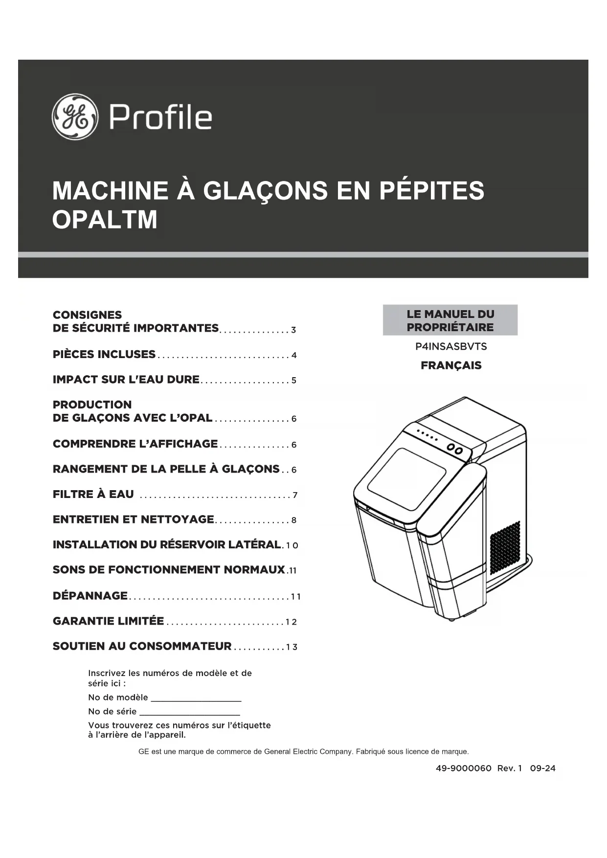 PROPRIÉTAIRE Inscrivez les numéros de modèle et de série ici : No de modèle __________________ No de série ____________________ Vous trouverez ces numéros sur l’étiquette à l’arrière de l’appareil.2 49-9000060 Rev. 0 NOUS VOUS REMERCIONS D’INTÉGRER GE APPLIANCES À VOTRE DEMEURE. Que vous ayez grandi avec des électroménagers GE ou qu’il s’agisse de votre première acquisition, nous sommes heureux de vous accueillir dans notre famille. Nous sommes fiers du savoir-faire, de l’innovation et du design qui constituent chaque électroménager GE, et nous pensons que vous le serez aussi. Nous vous rappelons que l’enregistrement de votre électroménager vous assure de recevoir des renseignements importants sur le produit et la garantie lorsque vous en avez besoin.49-9000060 Rev. 0 3 ATTENTION Pour réduire le risque de blessure lors de l’utilisation de votre Opal, observez les consignes de sécurité élémentaires suivantes.Ŷ 1HUHWLUH]DXFXQHpWLTXHWWHDSSRVpHVXUODPDFKLQHjglaçons qui présente des renseignements sur la sécurité, les avertissements ou le produit. Ŷ 5LVTXHDVVRFLpjXQHFKDUJHORXUGH1RXVUHFRPPDQGRQVTXHGHX[SHUVRQQHVGpSODFHQWHWLQVWDOOHQWODPDFKLQHjJODoRQVDILQde prévenir les blessures.
