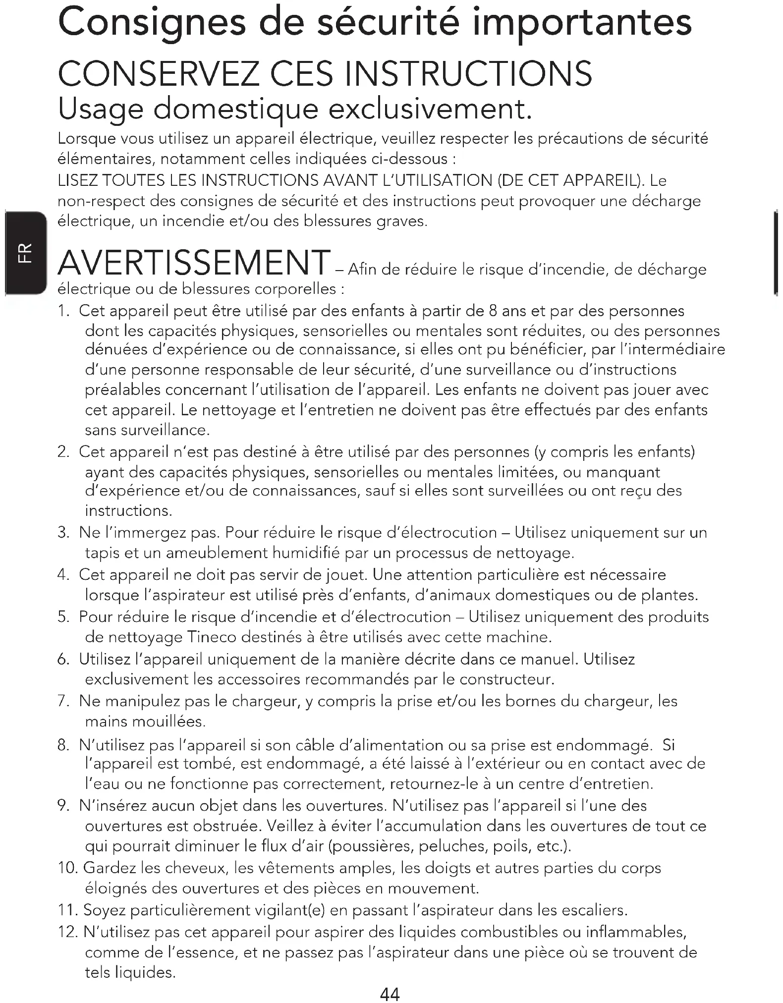 - Manipulation ou fonctionnement négligent, mauvaise utilisation, abus et/ou manque d’entretien ou utilisation non conforme au manuel d’utilisation Tineco.