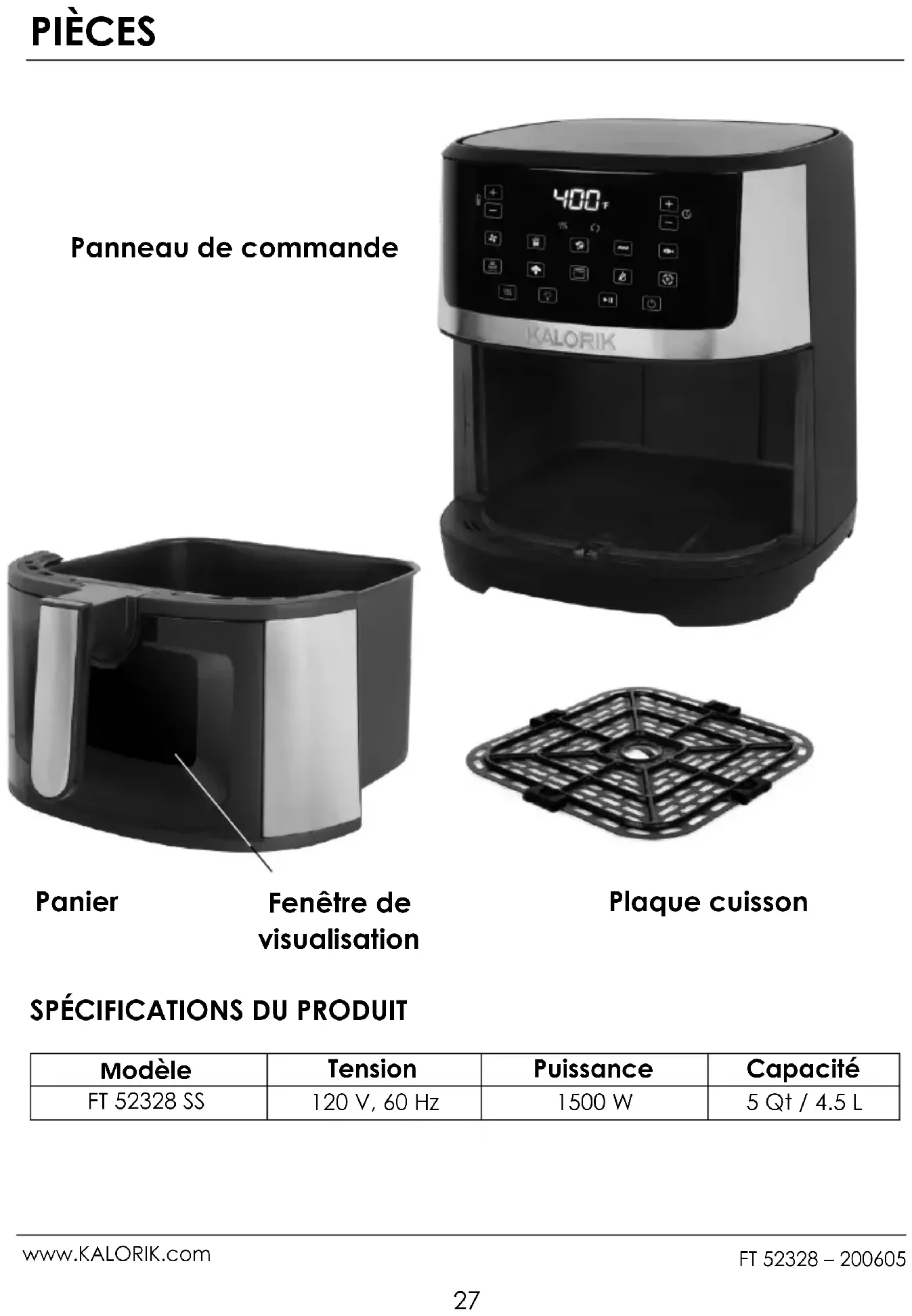 Modèle Tension Puissance Capacité FT 52328 SS 120 V, 60 Hz 1500 W 5 Qt / 4.5 L Panier Panneau de commande Fenêtre de visualisation Plaque cuissonFT 52328 – 200605