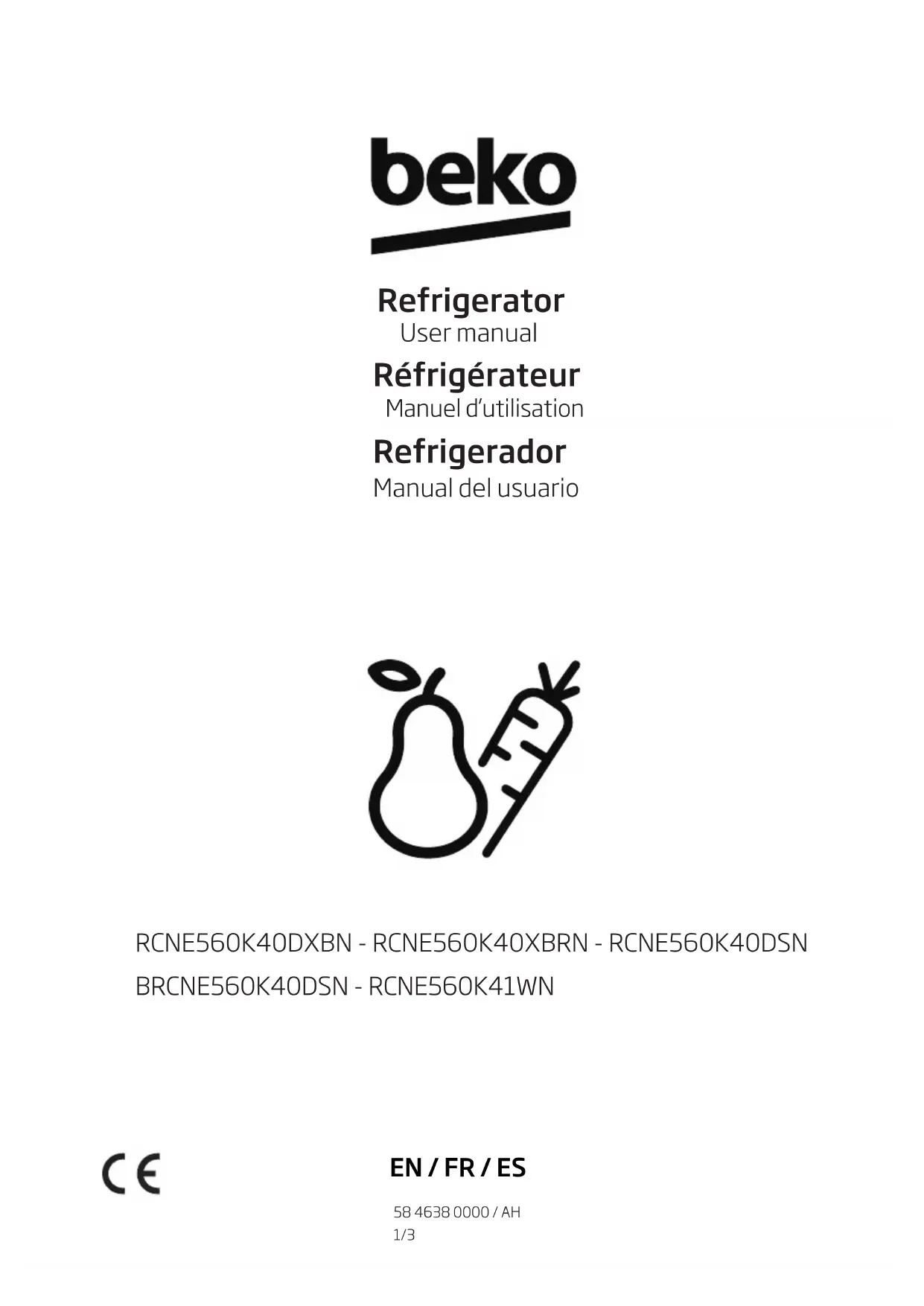 pas à résoudre le problème même après avoir suivi les instructions données dans cette section, contactez votre revendeur ou le prestataire de services agréé. N'essayez jamais de réparer un appareil défectueux.CLAUSE DE NON-RESPONSABILITÉ / AVERTISSEMENT Il est possible de remédier à certaines défaillances (simples) de manière adéquate par l'utilisateur final sans qu'il y ait de problème de sécurité ou d'utilisation dangereuse, à condition qu'elles soient effectuées dans les limites et conformément aux instructions suivantes (voir la section « Auto- réparation »). Dès lors, sauf autorisation contraire dans la section « Auto-réparation » ci-dessous, les réparations doivent être adressées à des réparateurs professionnels agréés afin d'éviter les problèmes de sécurité. Un réparateur professionnel agréé est un réparateur professionnel à qui le fabricant a donné accès aux instructions et à la liste des pièces détachées de ce produit selon les méthodes décrites dans les actes législatifs en application de la directive 2009/125/CE. Par contre, tel que mentionné dans le manuel d'utilisation/carte de garantie, seul l'agent de service (c'est-à-dire les réparateurs professionnels agréés) que vous pouvez joindre au numéro de téléphone indiqué dans le manuel d'utilisation/carte de garantie ou par l'intermédiaire de votre revendeur agréé peut fournir un service dans le cadre des conditions de garantie. Par conséquent, veuillez noter que les réparations effectuées Beko)par des réparateurs professionnels (qui ne sont pas autorisés par ) annuleront la garantie. Auto-réparation L’utilisateur final peut lui-même réparer les pièces de rechange ci-après : poignées de porte, charnières de porte, plateaux, paniers et joints de porte (une liste mise à jour est également disponible à l'adresse support. beko.com au 1er mars 2021). En outre, pour garantir la sécurité du produit et éviter tout risque de blessure grave, l'autoréparation mentionnée doit être effectuée en suivant les instructions du manuel d'utilisation pour l'autoréparation ou qui sont disponibles danssupport.beko.com Pour votre sécurité, débranchez le produit avant de tenter toute autoréparation. Les réparations et tentatives de réparation par les utilisateurs finaux pour les pièces ne figurant pas dans cette liste et/ou ne suivant pas les instructions des manuels d'utilisation pour l'autoréparation ou qui sont disponibles dans support. beko.com, pourrait donner lieu à des problèmes de sécurité non imputables à Beko, et annulera la garantie du produit. Il est donc fortement recommandé aux utilisateurs finaux de s'abstenir de tenter d'effectuer des réparations ne figurant pas sur la liste des pièces de rechange mentionnée, en s'adressant dans ce cas à des réparateurs professionnels autorisés ou à des réparateurs professionnels agréés. Au contraire, de telles tentatives de la part des utilisateurs finaux peuvent causer des problèmes de sécurité et endommager le produit et, par la suite, provoquer un incendie, une inondation, une électrocution et des blessures corporelles graves.Sans être exhaustives, les réparations suivantes par exemple doivent être effectuées par des personnes qualifiées :les réparateurs professionnels ou les réparateurs professionnels agréés : compresseur, circuit de refroidissement, carte mère,carte de convertisseur, carte d’affichage, etc. Le fabricant/vendeur ne peut être tenu responsable dans tous les cas où les utilisateurs finaux ne se conforment pas à ce qui précède. La disponibilité des pièces de rechange du réfrigérateur que vous avez acheté est de 10 ans. P endant cette période, des pièces de rechange originales seront disponibles pour faire fonctionner correctement le réfrigérateur. La durée minimale de garantie du réfrigérateur que vous avez acheté est de 24 mois. Cet appareil est doté d’une source d’éclairage de classe énergétique «G». Seuls des réparateurs qualifiés sont autorisés à procéder au remplacement de la source d’éclairage de cet appareil.Lea este manual de usuario antes de utilizar el aparato. Estimado cliente: Esperamos que este aparato, que ha sido fabricado en plantas dotadas de la más avanzada tecnología y sometido a los más estrictos procedimientos de control de calidad, le preste un servicio eficaz. Por lo tanto, lea detenidamente este manual de instrucciones antes de utilizar el aparato y guardar el manual como referencia. Si entrega el aparato a otro propietario, no olvide incluir el manual de usuario. El manual del usuario le ayudará a usar el aparato de manera rápida y segura.