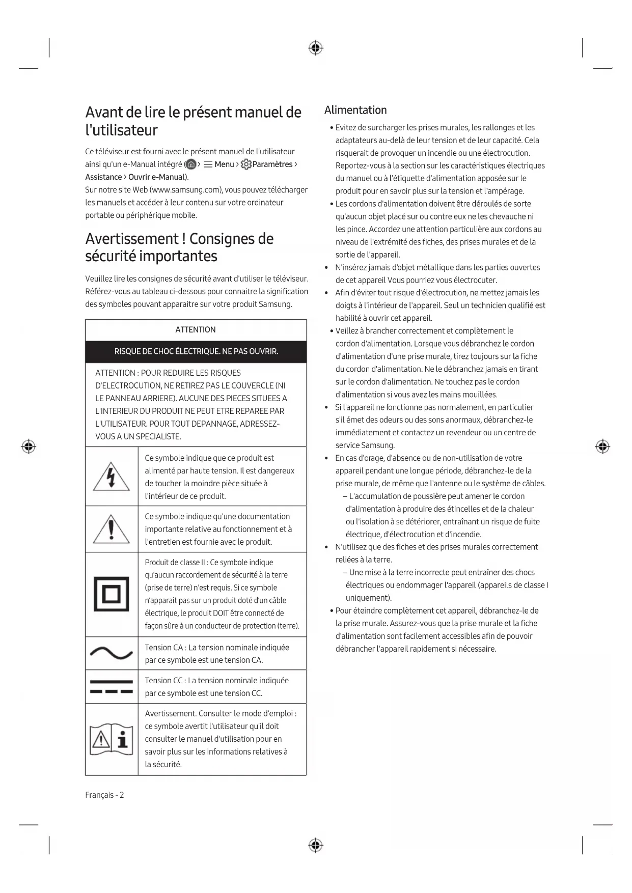 - Pour éteindre complètement cet appareil, débranchez-le de la prise murale. Assurez-vous que la prise murale et la fiche d'alimentation sont facilement accessibles afin de pouvoir débrancher l'appareil rapidement si nécessaire. Avant de lire le présent manuel de l'utilisateur Ce téléviseur est fourni avec le présent manuel de l'utilisateur ainsi qu'un e-Manual intégré ( > Menu > Paramètres > Assistance > Ouvrir e-Manual). Sur notre site Web (www.samsung.com), vous pouvez télécharger les manuels et accéder à leur contenu sur votre ordinateur portable ou périphérique mobile. Avertissement! Consignes de sécurité importantes Veuillez lire les consignes de sécurité avant d'utiliser le téléviseur. Référez-vous au tableau ci-dessous pour connaitre la signification des symboles pouvant apparaitre sur votre produit Samsung. ATTENTION RISQUE DE CHOC ÉLECTRIQUE. NE PAS OUVRIR.