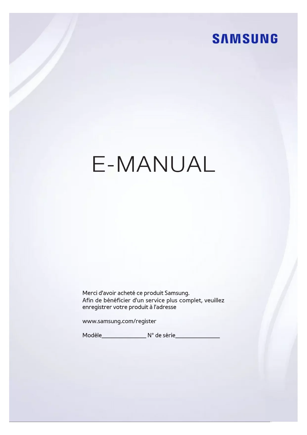 E-MANUAL Merci d'avoir acheté ce produit Samsung. Afin de bénéficier d'un service plus complet, veuillez enregistrer votre produit à l'adresse www.samsung.com/register Modèle______________ N° de série______________Contenu Connexion de l'antenne et de périphériques externes Connexion - Avec antenne Connexion de périphériques vidéo 3 Connexion - HDMI 4 Connexion - Composant 5 Connexion - Entrée externe 6 Connexion - Péritel Utilisation des haut-parleurs externes pour écouter la télévision 8 Connexion - Audio numérique (Optique) 9 Connexion - Sortie audio Connexion à un ordinateur 11 Connexion - Port HDMI 12 Connexion - Port HDMI (DVI) 13 Connexion - Réseau domestique Connexion à l'aide d'un périphérique mobile 15 Connexion - Câble MHL vers HDMI 16 Ecran du périphérique mobile sur le téléviseur (Réplication de l'écran) 17 Connexion de périphériques mobiles sans routeur sans fil (Wi-Fi Direct) 17 Connexion - Réseau domestique 18 Nom du téléviseur sur le réseau Sélection du signal d'entrée Utilisation d'une télécommande et de périphériques Commande du téléviseur à l'aide d'un clavier 19 Connexion d'un clavier 19 Utilisation du clavier Commande du téléviseur à l'aide d'une souris 21 Connexion d'une souris 22 Utilisation de la souris Saisie de texte à l'aide d'un clavier QWERTY 23 Utilisation des autres fonctions Connexion Internet Mise en place d'une connexion câblée à Internet 24 Connexion d'un câble LAN 25 Connexion automatique à un réseau Internet câblé 25 Connexion manuelle à un réseau Internet câblé Mise en place d'une connexion sans fil à Internet 27 Connexion automatique à un réseau Internet sans fil 28 Connexion manuelle à un réseau Internet sans fil 29 Connexion à un réseau Internet sans fil avec WPS Résolution des problèmes de connectivité Internet 30 Résolution des problèmes de connectivité Internet câblé 31 Résolution des problèmes de connectivité Internet sans fil Réseau mobile 32 Nom de modèle et services de télécommunications pris en charge Vérification de l'état de la connexion Internet IIFonctions Smart Smart Hub 34 Test de la connexion Smart Hub 35 Ouverture de l'Barre d'accès rapide 36 Accès à l'écran Panneau 36 Utilisation du Didacticiel Smart Hub 36 Réinitialisation de Smart Hub Utilisation de Smart Hub avec Compte Samsung 37 Création d'un Compte Samsung 39 Connexion au Compte Samsung 40 Liaison de mes comptes Samsung et d'application 41 Modification et ajout d'informations à un Compte Samsung 41 Suppression de tous les comptes Samsung du téléviseur 42 Utilisation des fonctions du menu contextuel 43 Installation d'une application 44 Applications par défaut 44 Utilisation de Web Browser 47 Réorganisation des applications dans l'écran SAMSUNG APPS 48 Suppression d'une application du téléviseur 48 Notation/évaluation d'une application 49 Mise à jour d'une application 49 Fonctionnalités SAMSUNG APPS Lecture de vidéos, de photos et de musique 51 Lecture de contenu multimédia à partir d'un périphérique USB 52 Lecture de contenu multimédia enregistré sur un ordinateur/ périphérique mobile 53 Affichage de photos 54 Lecture de vidéos 56 Lecture de musique 57 Fonctions de l'écran Liste de contenu multimédia Fonctions de visionnage de programmes télévisés Informations sur les diffusions numériques en bref 58 Utilisation du Guide 59 Consultation des informations sur les programmes actuels 59 Changement de signal de diffusion 59 Informations relatives au signal numérique et intensité Configuration d'un Programmer visionnage 60 Configuration d'Programmer visionnage 61 Gestion de la liste Programmer visionnage Utilisation du Liste des chaînes Enregistrement, suppression et modification de chaînes 63 Enregistrement et suppression de chaînes 63 Modification de chaînes enregistrées 64 Activation/désactivation de la protection par mot de passe sur des chaînes 64 Modification des numéros 64 Verrouillage/déverrouillage des chaînes 64 Modif. num. chaîne Création d'une Liste des favoris personnelle 65 Enregistrement d'une chaîne comme Favoris 66 Affichage des chaînes de la Liste des favoris uniquement 66 Modification d'une Liste des favoris Accentuation du réalisme des manifestations sportives 69 Activation du Mode Sport 69 Utilisation du Mode Sport (pour la Russie) 70 Fonctions disponibles en Mode Sport Mode Cinéma africain 70 Utilisation du Mode Cinéma africain Fonctions de prise en charge du visionnage de programmes télévisés 71 Affichage des sous-titres 71 Options de sous-titre 72 Modification de la Langue du télétexte 72 Texte numérique 73 Visionnage de programmes en mode PIP 74 Recherche des chaînes disponibles 75 Sélection des options audio du programme 75 Description audio 75 Sélection du genre 75 Activ. genre adulte II IIIUtilisation du Paramètres chaînes 76 Pays (zone) 76 Recherche manuelle 77 Réglage précis de l'écran 78 Transf. liste chaînes 78 Supprimer profil opérateur CAM 78 Système satellite 80 Interface commune Réglages de l'image et du son Changement du mode d'image et réglage de la qualité d'image 81 Choix du mode d'image le mieux adapté à l'environnement télévisuel 82 Réglage de la qualité de l'image de chaque mode d'image 83 Réglage précis de chaque mode d'image (Paramètres avancés) 85 Réglage de l'image pour faciliter le visionnage (Options d'image) Fonctions de prise en charge des images 86 Visionnage de programmes en mode PIP 87 Changement des options Format de l'image et Position 88 Diffusion du son seulement avec écran éteint (Image désactivée) 88 Réinitialisation des paramètres Mode Image Changement de Mode Son et utilisation d'effets sonores 89 Choix du Mode Son le mieux adapté à l'environnement 90 Utilisation d'effets sonores Fonctions de prise en charge du son 91 Choix des haut-parleurs 91 Désignation du type d'installation du téléviseur 91 Activation du son (Paramètres supplém.) 92 Réin
