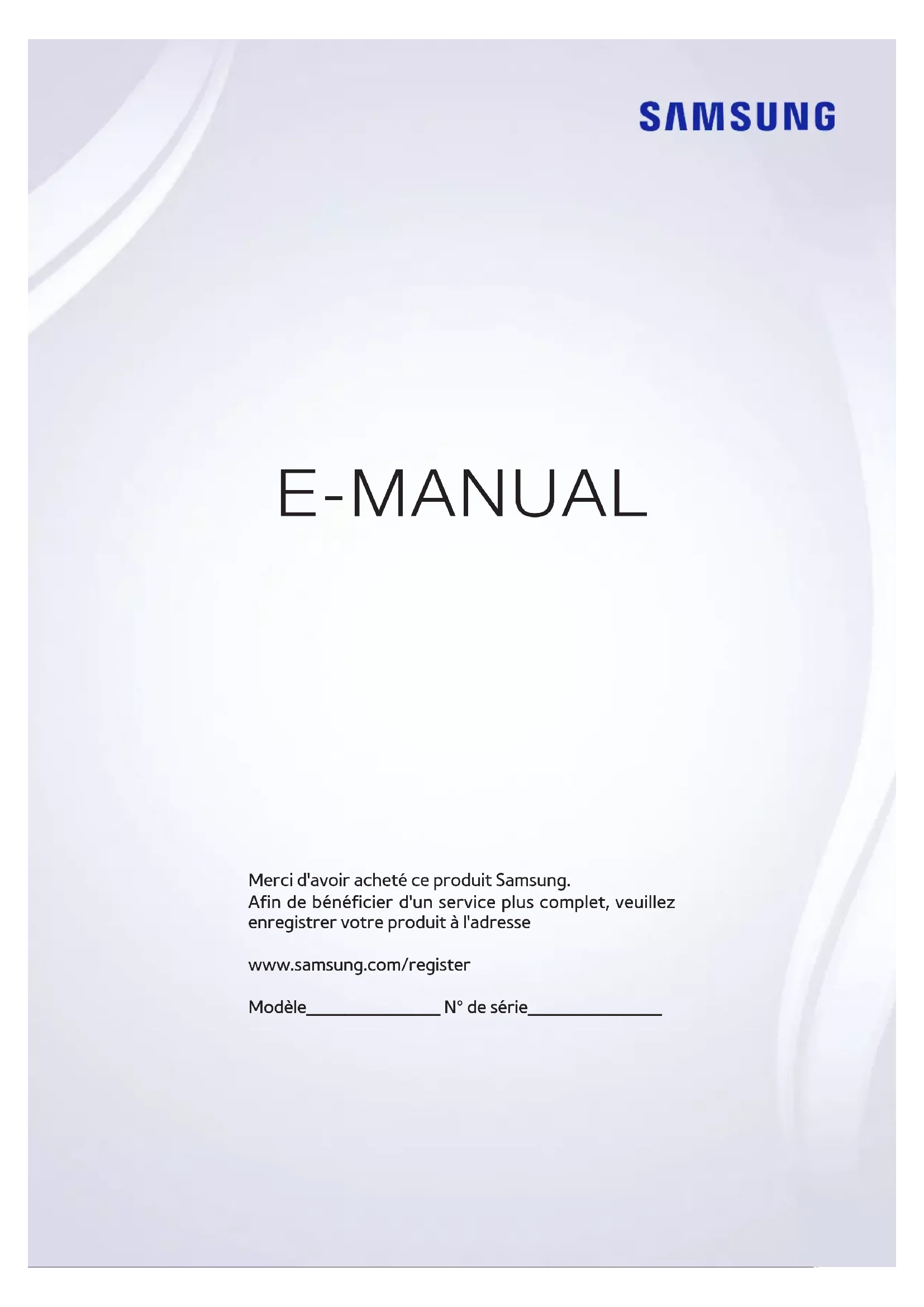 E-MANUAL Merci d'avoir acheté ce produit Samsung. Afin de bénéficier d'un service plus complet, veuillez enregistrer votre produit à l'adresse www.samsung.com/register Modèle______________ N° de série______________Contenu Connexion de l'antenne et de périphériques externes Connexion - Avec antenne Connexion de périphériques vidéo 3 Connexion - HDMI 4 Connexion - Composant 5 Connexion - Entrée externe 6 Connexion - Péritel Utilisation des haut-parleurs externes pour écouter la télévision 8 Connexion - Audio numérique (Optique) 9 Connexion - Sortie audio Connexion à un ordinateur 11 Connexion - Port HDMI 12 Connexion - Port HDMI (DVI) 13 Connexion - Réseau domestique Connexion à l'aide d'un périphérique mobile 15 Connexion - Câble MHL vers HDMI 16 Ecran du périphérique mobile sur le téléviseur (Réplication de l'écran) 17 Connexion de périphériques mobiles sans routeur sans fil (Wi-Fi Direct) 17 Connexion - Réseau domestique 18 Nom du téléviseur sur le réseau Sélection du signal d'entrée Utilisation d'une télécommande et de périphériques Commande du téléviseur à l'aide d'un clavier 19 Connexion d'un clavier 19 Utilisation du clavier Commande du téléviseur à l'aide d'une souris 21 Connexion d'une souris 22 Utilisation de la souris Saisie de texte à l'aide d'un clavier QWERTY 23 Utilisation des autres fonctions Connexion Internet Mise en place d'une connexion câblée à Internet 24 Connexion d'un câble LAN 25 Connexion automatique à un réseau Internet câblé 25 Connexion manuelle à un réseau Internet câblé Mise en place d'une connexion sans fil à Internet 27 Connexion automatique à un réseau Internet sans fil 28 Connexion manuelle à un réseau Internet sans fil 29 Connexion à un réseau Internet sans fil avec WPS Résolution des problèmes de connectivité Internet 30 Résolution des problèmes de connectivité Internet câblé 31 Résolution des problèmes de connectivité Internet sans fil Réseau mobile 32 Nom de modèle et services de télécommunications pris en charge Vérification de l'état de la connexion Internet IIFonctions Smart Smart Hub 34 Test de la connexion Smart Hub 35 Ouverture de l'Barre d'accès rapide 36 Accès à l'écran Panneau 36 Utilisation du Didacticiel Smart Hub 36 Réinitialisation de Smart Hub Utilisation de Smart Hub avec Compte Samsung 37 Création d'un Compte Samsung 39 Connexion au Compte Samsung 40 Liaison de mes comptes Samsung et d'application 41 Modification et ajout d'informations à un Compte Samsung 41 Suppression de tous les comptes Samsung du téléviseur 42 Utilisation des fonctions du menu contextuel 43 Installation d'une application 44 Applications par défaut 44 Utilisation de Web Browser 47 Réorganisation des applications dans l'écran SAMSUNG APPS 48 Suppression d'une application du téléviseur 48 Notation/évaluation d'une application 49 Mise à jour d'une application 49 Fonctionnalités SAMSUNG APPS Lecture de vidéos, de photos et de musique 51 Lecture de contenu multimédia à partir d'un périphérique USB 52 Lecture de contenu multimédia enregistré sur un ordinateur/ périphérique mobile 53 Affichage de photos 54 Lecture de vidéos 56 Lecture de musique 57 Fonctions de l'écran Liste de contenu multimédia Fonctions de visionnage de programmes télévisés Informations sur les diffusions numériques en bref 58 Utilisation du Guide 59 Consultation des informations sur les programmes actuels 59 Changement de signal de diffusion 59 Informations relatives au signal numérique et intensité Configuration d'un Programmer visionnage 60 Configuration d'Programmer visionnage 61 Gestion de la liste Programmer visionnage Utilisation du Liste des chaînes Enregistrement, suppression et modification de chaînes 63 Enregistrement et suppression de chaînes 63 Modification de chaînes enregistrées 64 Activation/désactivation de la protection par mot de passe sur des chaînes 64 Modification des numéros 64 Verrouillage/déverrouillage des chaînes 64 Modif. num. chaîne Création d'une Liste des favoris personnelle 65 Enregistrement d'une chaîne comme Favoris 66 Affichage des chaînes de la Liste des favoris uniquement 66 Modification d'une Liste des favoris Accentuation du réalisme des manifestations sportives 69 Activation du Mode Sport 69 Utilisation du Mode Sport (pour la Russie) 70 Fonctions disponibles en Mode Sport Mode Cinéma africain 70 Utilisation du Mode Cinéma africain Fonctions de prise en charge du visionnage de programmes télévisés 71 Affichage des sous-titres 71 Options de sous-titre 72 Modification de la Langue du télétexte 72 Texte numérique 73 Visionnage de programmes en mode PIP 74 Recherche des chaînes disponibles 75 Sélection des options audio du programme 75 Description audio 75 Sélection du genre 75 Activ. genre adulte II IIIUtilisation du Paramètres chaînes 76 Pays (zone) 76 Recherche manuelle 77 Réglage précis de l'écran 78 Transf. liste chaînes 78 Supprimer profil opérateur CAM 78 Système satellite 80 Interface commune Réglages de l'image et du son Changement du mode d'image et réglage de la qualité d'image 81 Choix du mode d'image le mieux adapté à l'environnement télévisuel 82 Réglage de la qualité de l'image de chaque mode d'image 83 Réglage précis de chaque mode d'image (Paramètres avancés) 85 Réglage de l'image pour faciliter le visionnage (Options d'image) Fonctions de prise en charge des images 86 Visionnage de programmes en mode PIP 87 Changement des options Format de l'image et Position 88 Diffusion du son seulement avec écran éteint (Image désactivée) 88 Réinitialisation des paramètres Mode Image Changement de Mode Son et utilisation d'effets sonores 89 Choix du Mode Son le mieux adapté à l'environnement 90 Utilisation d'effets sonores Fonctions de prise en charge du son 91 Choix des haut-parleurs 91 Désignation du type d'installation du téléviseur 91 Activation du son (Paramètres supplém.) 92 Réin