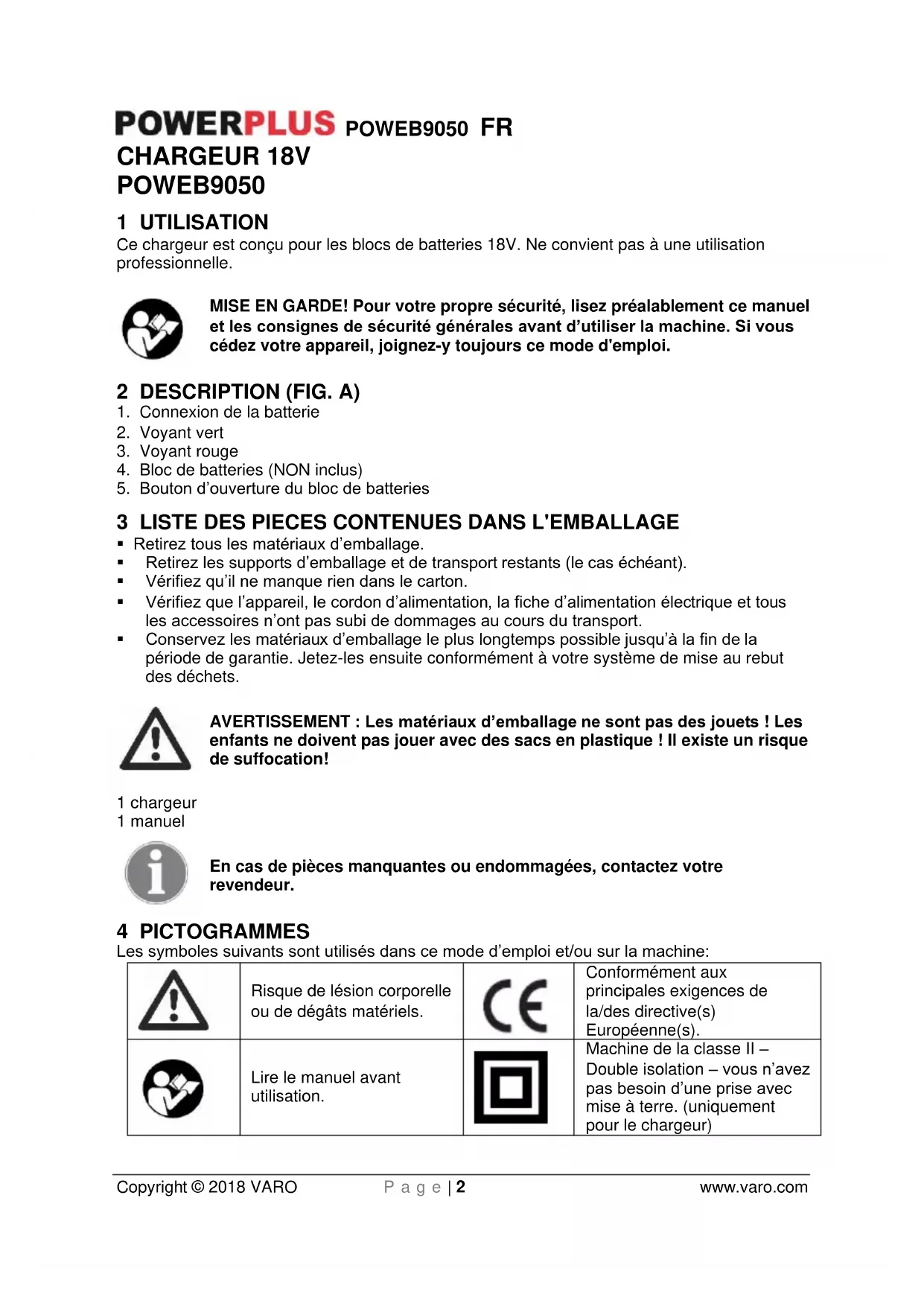 Machine de la classe II – Double isolation – vous n’avez pas besoin d’une prise avec mise à terre. (uniquement pour le chargeur)POWEB9050 FR Copyright © 2018 VARO P a g e | 3 www.varo.com