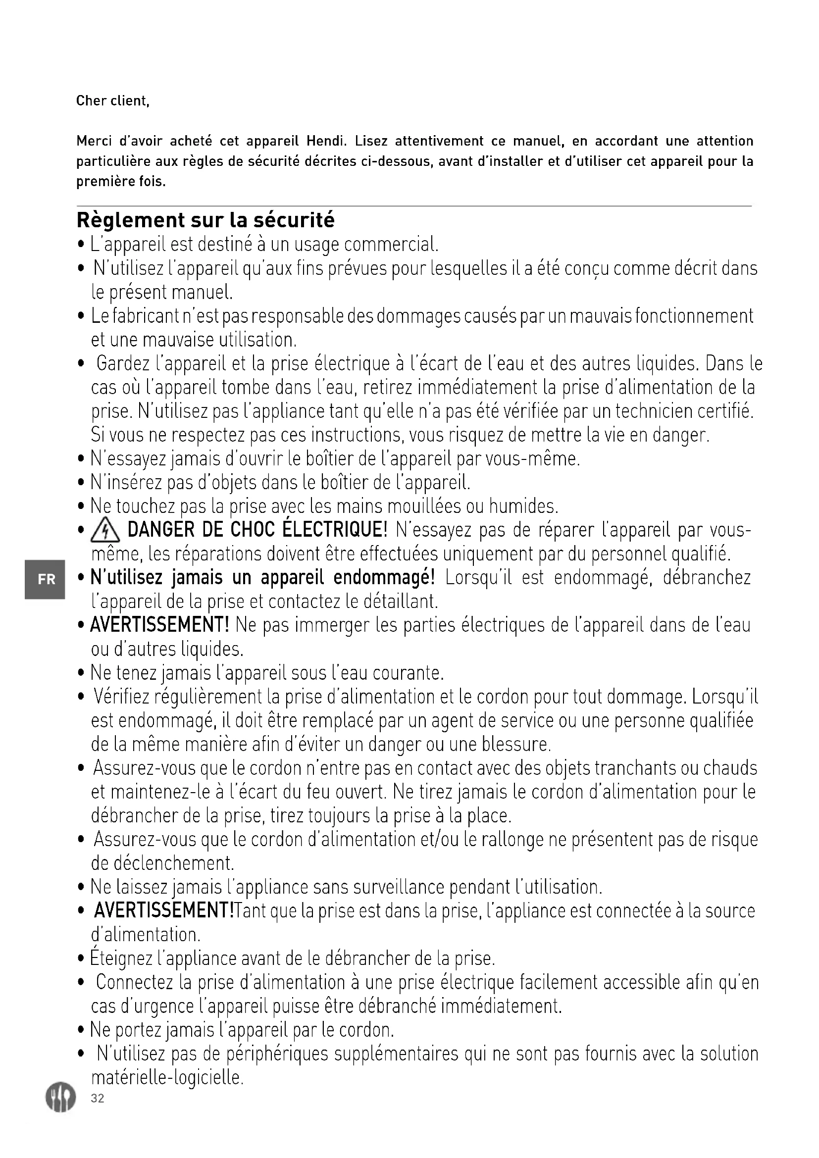 Cher client, Merci d’avoir acheté cet appareil Hendi. Lisez attentivement ce manuel, en accordant une attention particulière aux règles de sécurité décrites ci-dessous, avant d’installer et d’utiliser cet appareil pour la première fois. Règlement sur la sécurité