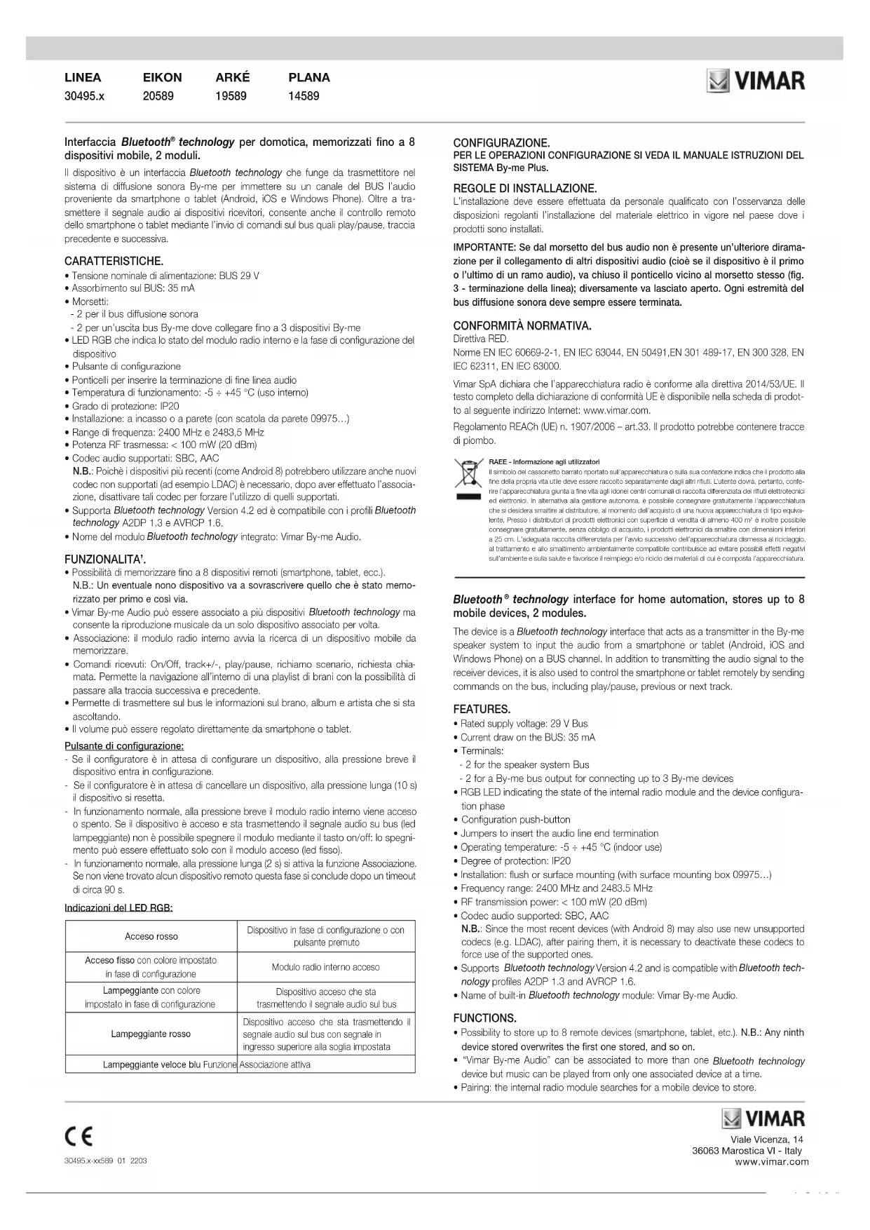 rage. Si le système ne trouve aucun dispositif à distance, cette phase se termine après un délai d'attente de 90 s. Signalisation de la LED RVB Allumée rouge Dispositif en phase de configuration ou bouton actionné Allumée fixe de la couleur définie en phase de configuration Module radio interne allumé Clignotante de la couleur définie en phase de configuration Dispositif allumé pour transmission du signal audio sur le bus Clignotante rouge Dispositif allumé pour transmission du signal audio sur le bus avec signal en entrée supérieur au seuil prédéfini Bleue, clignotement rapide Fonction d'appairage activeViale Vicenza, 14 36063 Marostica VI - Italy www.vimar.com 30495.x-xx589 01 2203 LINEA 30495.x EIKON