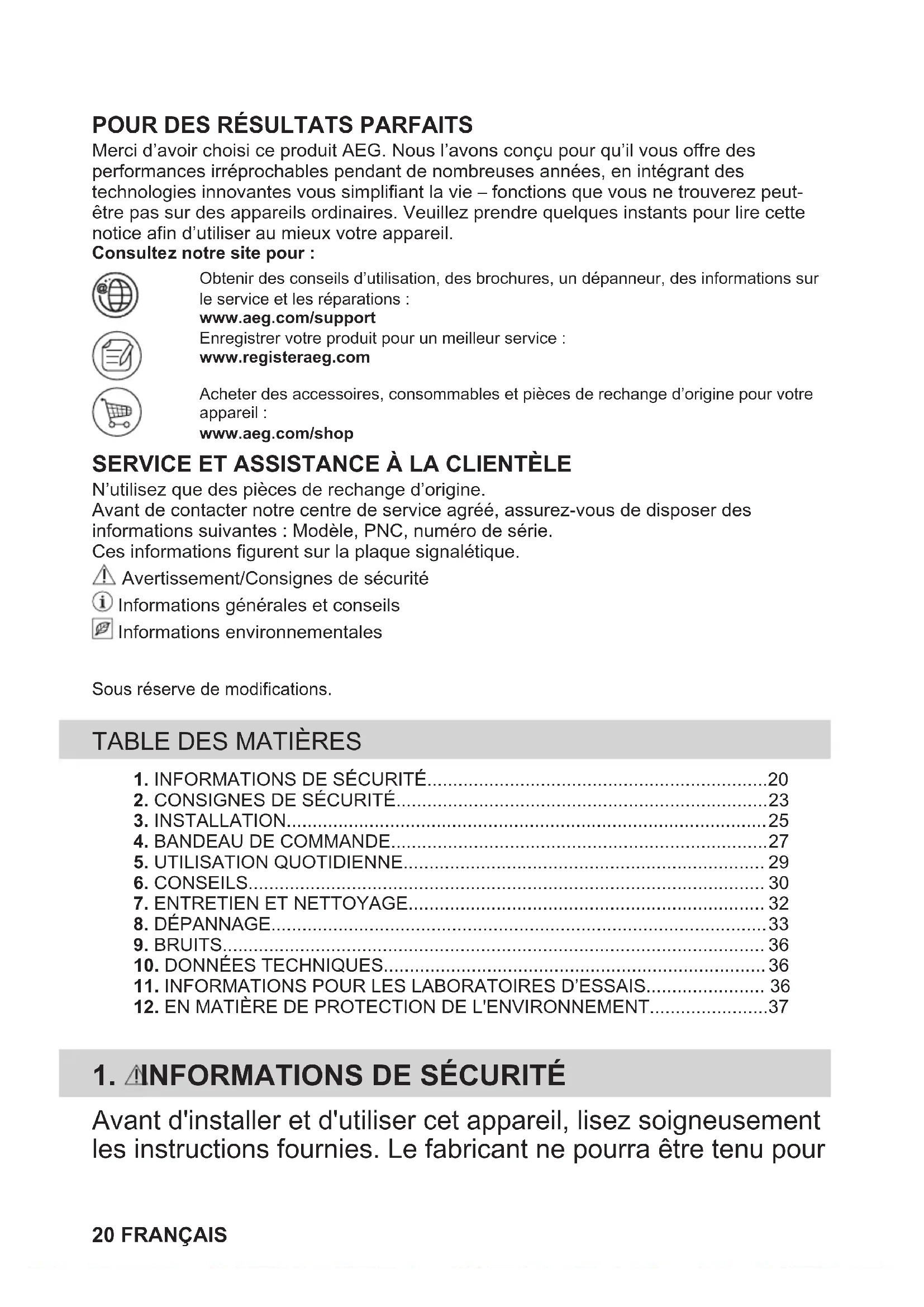 Merci d’avoir choisi ce produit AEG. Nous l’avons conçu pour qu’il vous offre desperformances irréprochables pendant de nombreuses années, en intégrant destechnologies innovantes vous simplifiant la vie – fonctions que vous ne trouverez peut-être pas sur des appareils ordinaires. Veuillez prendre quelques instants pour lire cettenotice afin d’utiliser au mieux votre appareil.Consultez notre site pour :Obtenir des conseils d’utilisation, des brochures, un dépanneur, des informations surle service et les réparations :www.aeg.com/supportEnregistrer votre produit pour un meilleur service :www.registeraeg.comAcheter des accessoires, consommables et pièces de rechange d’origine pour votreappareil :www.aeg.com/shop