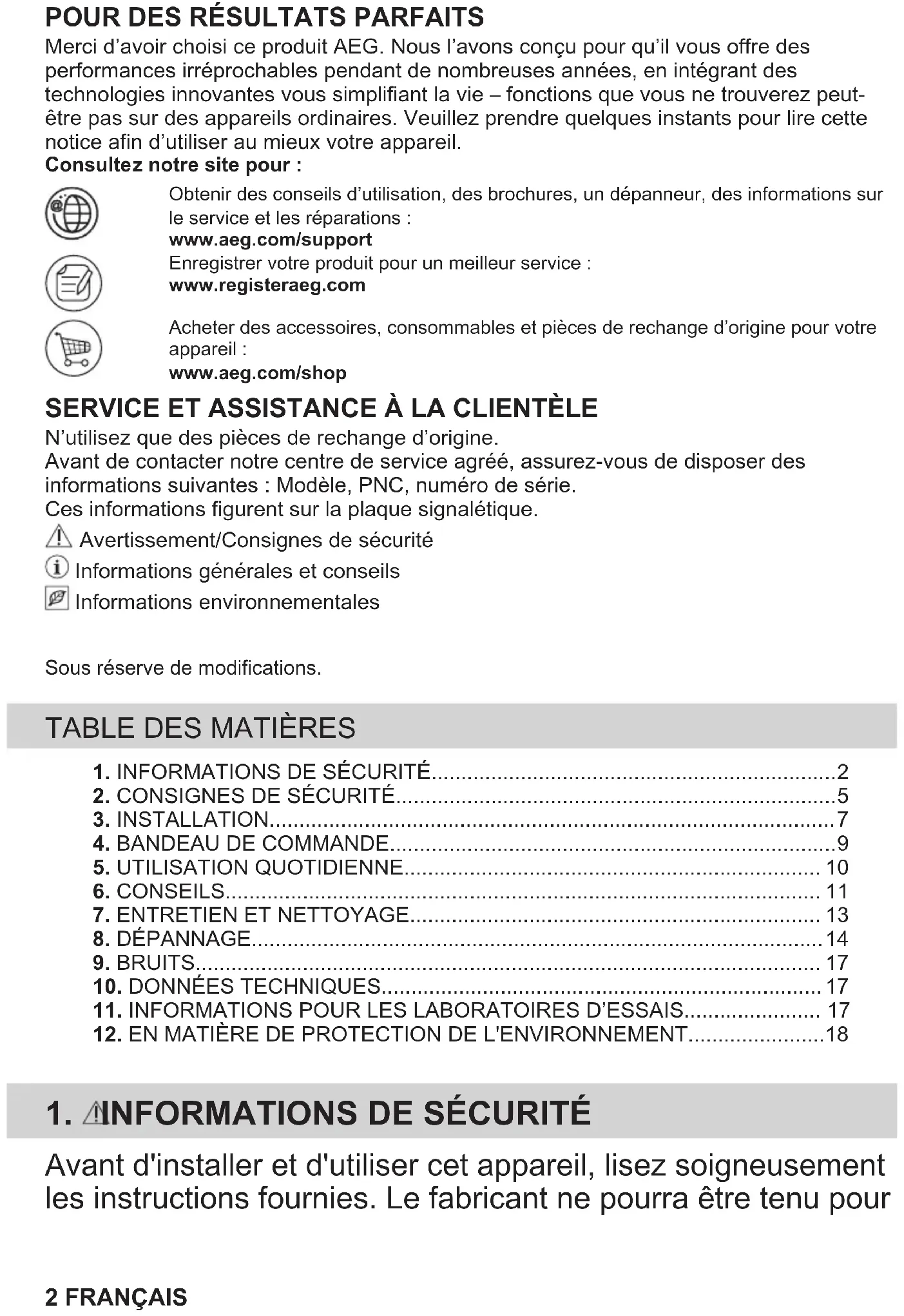 FR Notice d'utilisation | Congélateur 2 IT Istruzioni per l’uso | Congelatore 19 aeg.com\registerPOUR DES RÉSULTATS PARFAITS Merci d’avoir choisi ce produit AEG. Nous l’avons conçu pour qu’il vous offre desperformances irréprochables pendant de nombreuses années, en intégrant destechnologies innovantes vous simplifiant la vie – fonctions que vous ne trouverez peut-être pas sur des appareils ordinaires. Veuillez prendre quelques instants pour lire cettenotice afin d’utiliser au mieux votre appareil.Consultez notre site pour :Obtenir des conseils d’utilisation, des brochures, un dépanneur, des informations surle service et les réparations :www.aeg.com/supportEnregistrer votre produit pour un meilleur service :www.registeraeg.comAcheter des accessoires, consommables et pièces de rechange d’origine pour votreappareil :www.aeg.com/shop