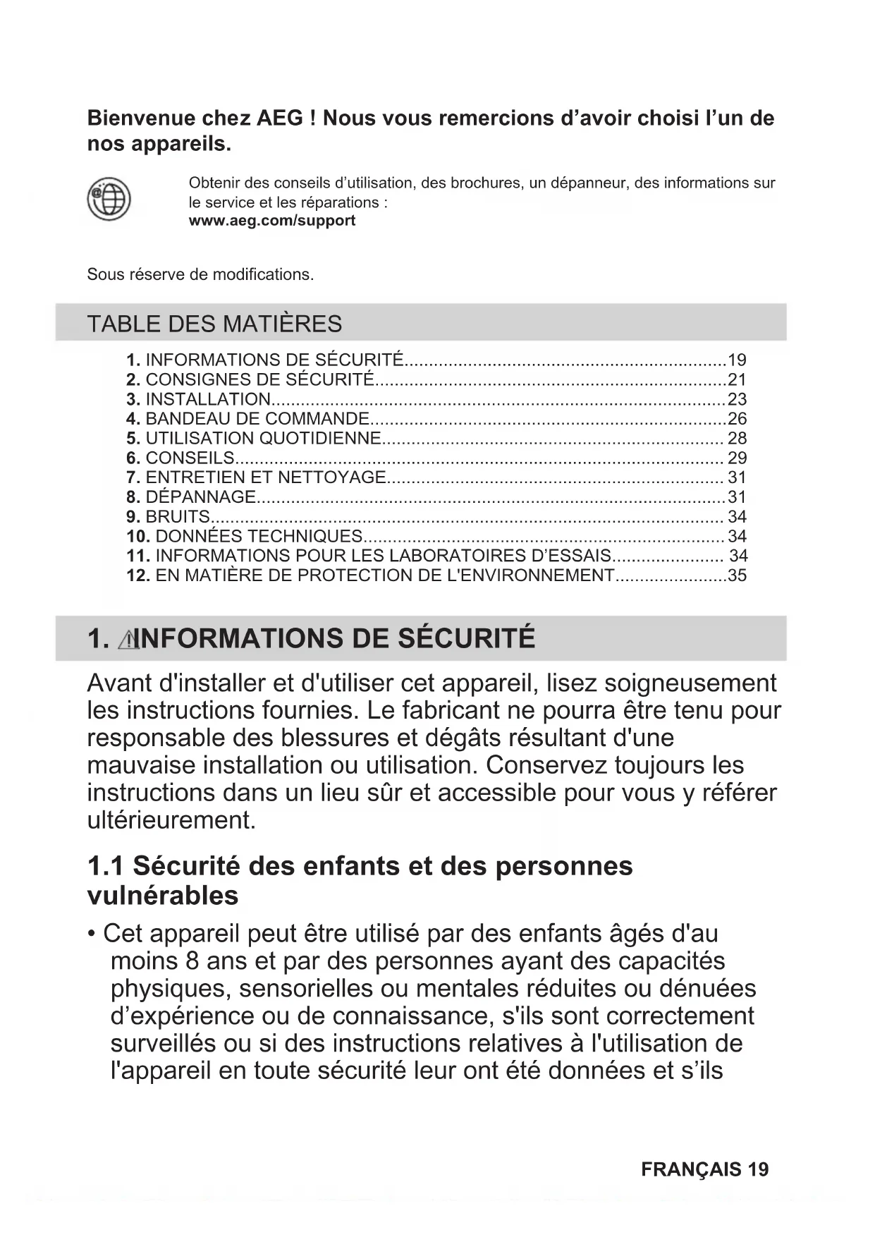 Recyclez les matériaux portant le symbole . Déposez les emballages dans les conteneurs prévus à cet effet. Contribuez à la protection de l'environnement et à votre sécurité, recyclez vos produits électriques et électroniques. Ne jetez pas les appareils portant le symbole avec les ordures ménagères. Emmenez un tel produit dans votre centre local de recyclage ou contactez vos services municipaux. Concerne la France uniquement : FRANÇAIS 35Willkommen bei AEG! Danke, dass du dich für unser Gerät entschieden hast. Um Anwendungshinweise, Prospekte, Informationen zu Fehlerbehebung, Service undReparatur zu erhalten:www.aeg.com/supportÄnderungen vorbehalten. INHALTSVERZEICHNIS