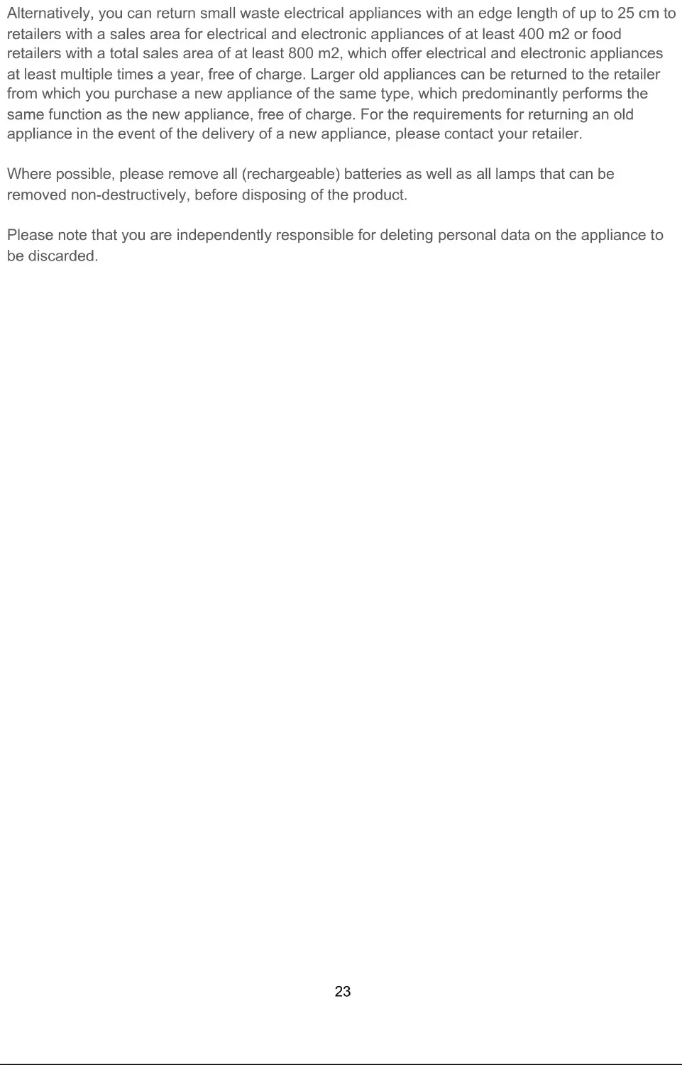 Le symbole de la poubelle rayée sur roues sur le produit ou son emballage signifie que l’appareil ne doit pas être jeté avec les ordures ménagères, mais nécessite une élimination séparée. Vous pouvez déposer gratuitement l’appareil usagé dans un point de collecte municipal approprié pour les appareils usagés électriques et électroniques, comme par exemple un centre de recyclage. Vous pouvez obtenir les adresses auprès de votre municipalité.23 Vous pouvez également retourner gratuitement les petits appareils électriques usagés avec une longueur de bord allant jusqu’à 25 cm chez les revendeurs avec une surface de vente pour les appareils électriques et électroniques de minimum 400 m2 ou les commerces alimentaires avec une surface de vente totale de minimum 800 m2, qui proposent des équipements électriques et électroniques au moins plusieurs fois par an. Les appareils usagés plus volumineux peuvent être retournés gratuitement chez un revendeur lors de l’achat d’un nouvel appareil du même type, qui remplit essentiellement les mêmes fonctions que le nouvel appareil. Pour les modalités de retour d’un ancien appareil en cas de livraison du nouvel appareil, veuillez contacter votre revendeur. Avant d’éliminer le produit, veuillez, dans la mesure du possible, retirer toutes les piles et batteries ainsi que toutes les lampes qui peuvent être retirées sans destruction. Nous attirons votre attention sur le fait que vous êtes responsable de la suppression des données personnelles sur l’appareil à éliminer.1 INHOUDSOPGAVE