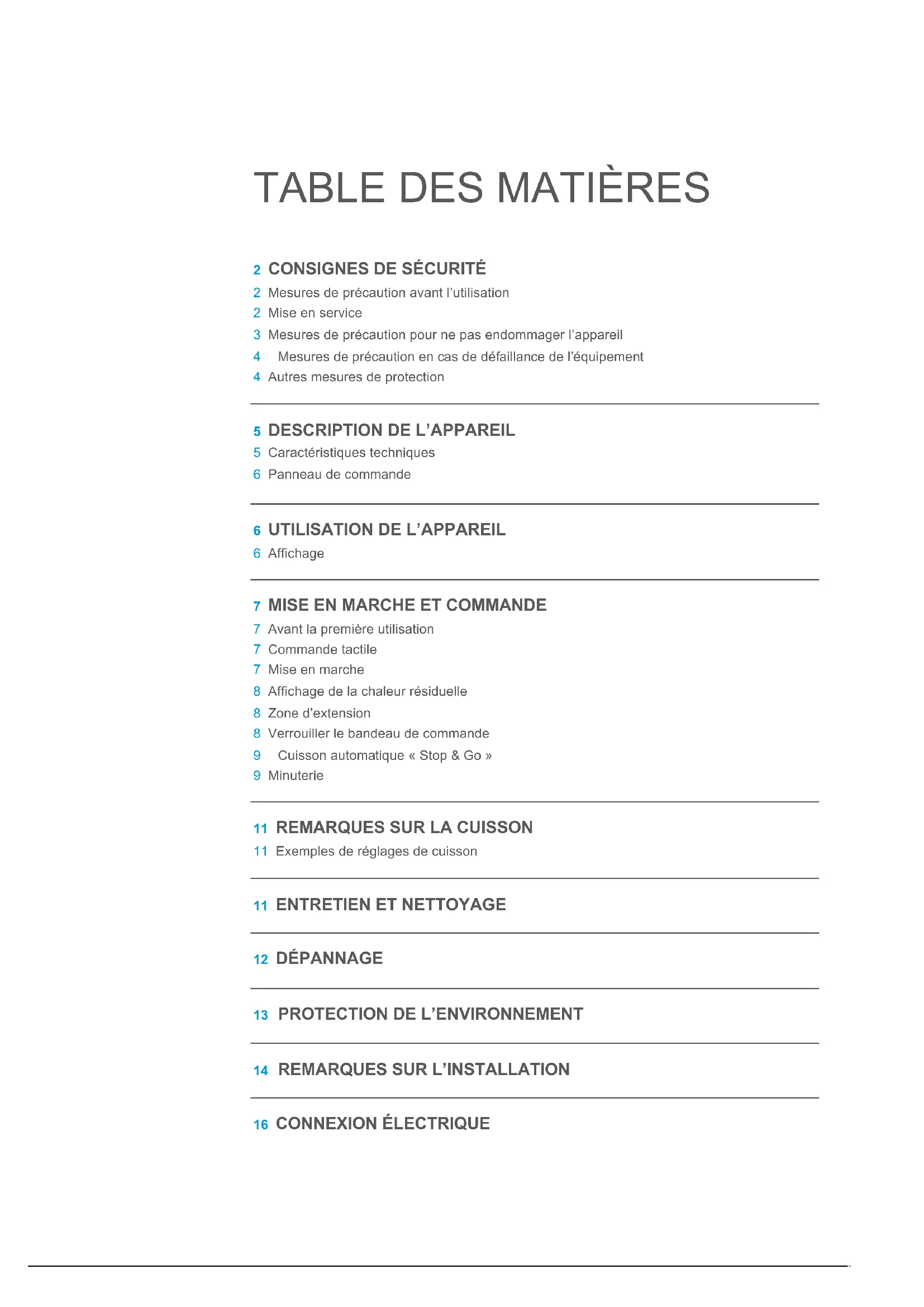 7 Avant la première utilisation 7 Commande tactile 7 Mise en marche 8 Affichage de la chaleur résiduelle 8 Zone d’extension 8 Verrouiller le bandeau de commande 9 Cuisson automatique « Stop & Go » 9 Minuterie