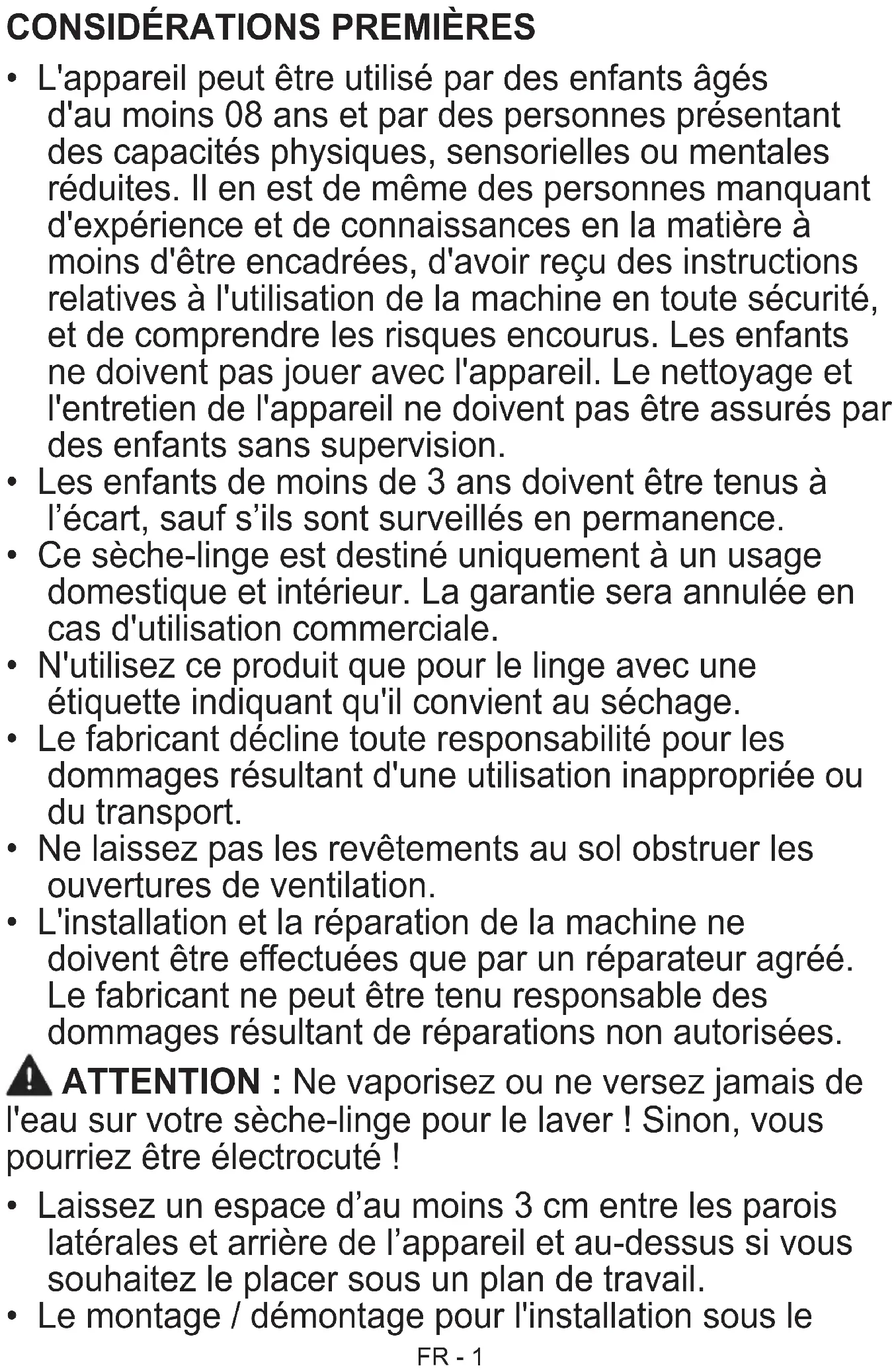 - Ce sèche-linge est destiné uniquement à un usage domestique et intérieur. La garantie sera annulée en cas d'utilisation commerciale.