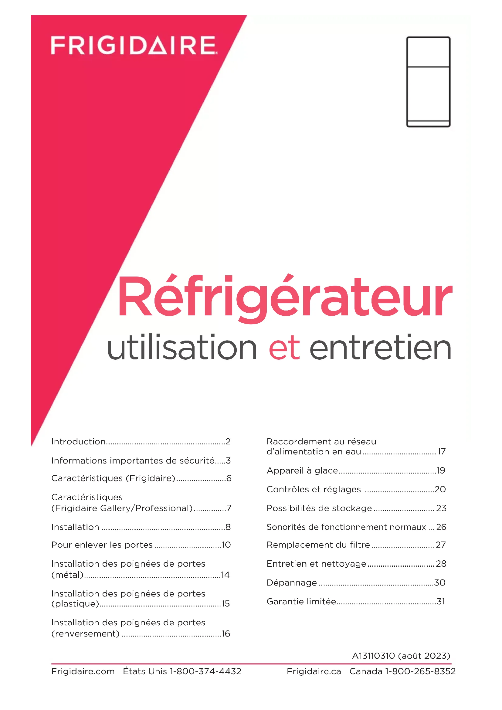 - Frigidaire.com États Unis 1-800-374-4432 Frigidaire.ca Canada 1-800-265-8352 Réfrigérateur utilisation et entretien A13110310 (août 2023) Introduction p. 2