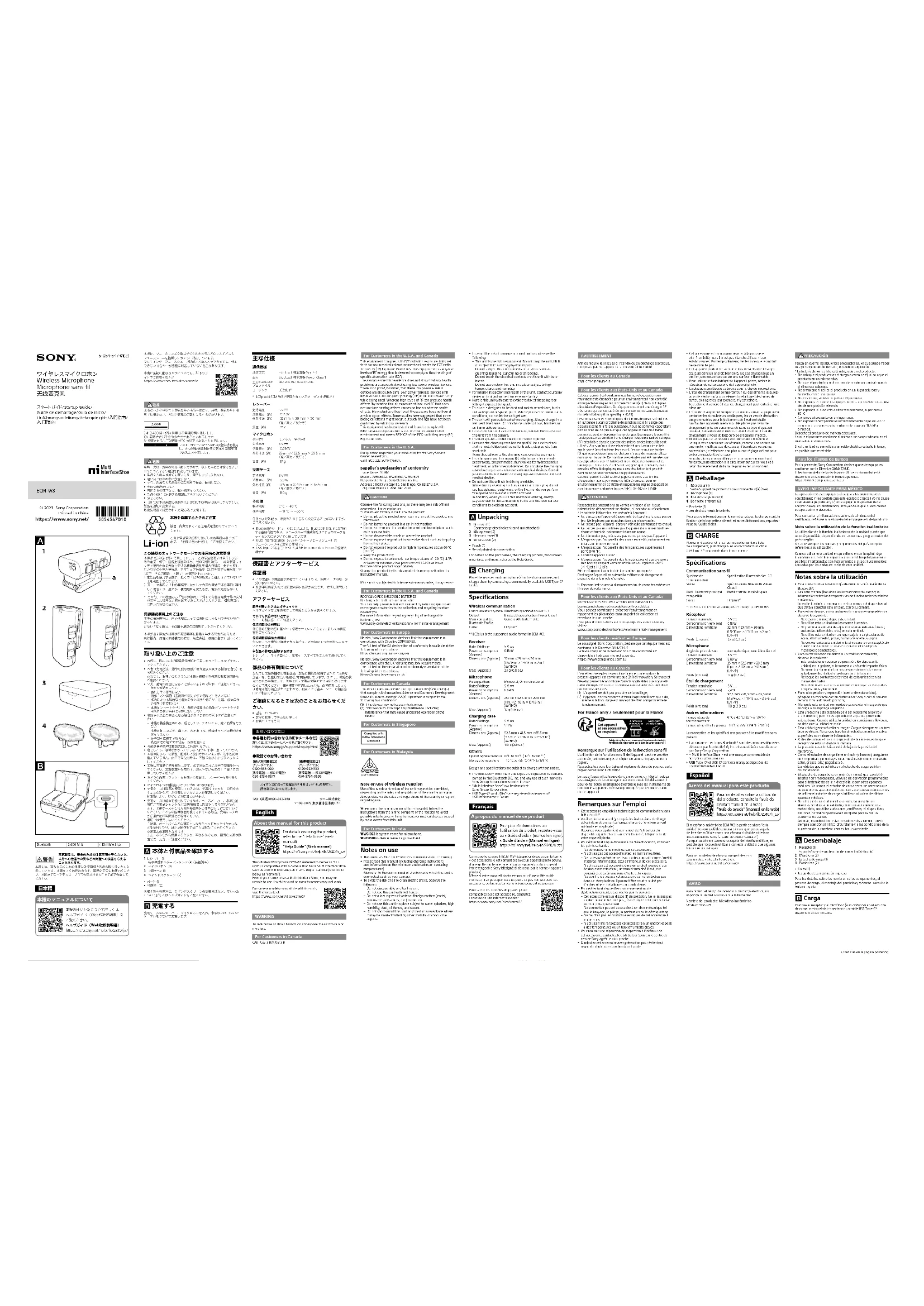 LC3plus is the supported audio format in ECM-W3.ReceiverRated Voltage 5 V Power consumption (Approx.)0.18 WDimensions (Approx.) 32 mm × 29 mm × 50 mm (1 5/16 in. × 1 3/16 in. × 2 in.)(W/H/D)Mass (Approx.) 25 g (0.9 oz.)MicrophonePickup pattern Monaural, Omni-directionalRated Voltage 5 V Power consumption (Approx.)0.09 WDimensions (Approx.) 25 mm × 52.5 mm × 20.5 mm(1 in. × 2 1/8 in. × 13/16 in.)(W/H/D)Mass (Approx.) 17 g (0.6 oz.)Charging caseRated Voltage 5 V Power consumption (Approx.)5.9 WDimensions (Approx.) 92.5 mm × 41.5 mm × 65.5 mm (3 3/4 in. × 1 11/16 in. × 2 5/8 in.)(W/H/D)Mass (Approx.) 110 g (3.9 oz.)OthersOperating temperature 0 °C to 40 °C (32 °F to 104 °F)Storage temperature –10 °C to +55 °C (14 °F to 131 °F)Design and specifications are subject to change without notice.• The Bluetooth® word mark and logos are registered trademarks owned by the Bluetooth SIG, Inc. and any use of such marks by Sony Group Corporation is under license.• “Multi Interface Shoe” is a trademark of Sony Group Corporation.• USB Type-C® and USB-C® are registered trademarks of USB Implementers Forum. À propos du manuel de ce produitPour plus d'informations sur l'utilisation du produit, reportez-vous au « Guide d’aide » (manuel en ligne).« Guide d'aide » (Manuel en ligne)https://rd1.sony.net/help/ilc/2340/h_zz/ Ce microphone sans fil ECM-W3 (désigné ci-dessous par le terme « cet accessoire ») est compatible avec un appareil photo pourvu d’une griffe multi-interface tel qu'un appareil photo à objectif interchangeable Sony (désigné ci-dessous par le terme « appareil photo »).Même si votre appareil photo est pourvu d’une griffe multi-interface, il se peut que vous ne puissiez pas l’utiliser avec cet accessoire, ou bien certaines fonctions peuvent ne pas agir.Pour savoir les modèles d’appareil photo compatibles avec cet accessoire, consultez l’adresse de site internet suivante : https://www.sony.net/dics/ecmw3/AVERTISSEMENTAfin de réduire les risques d’incendie ou de décharge électrique, n’exposez pas cet appareil à la pluie ou à l’humidité.Pour les clients au CanadaCAN ICES-3 B/NMB-3 BPour les clients aux États-Unis et au CanadaCet équipement est conforme aux limites d’exposition aux rayonnements énoncées pour un environnement non contrôlé et respecte les règles les radioélectriques (RF) de la FCC lignes directrices d’exposition. Cet équipement émet une énergie RF très faible qui est considérée comme conforme sans évaluation du débit d’absorption spécifique (DAS).Les connaissances scientifiques dont nous disposons n’ont mis en évidence aucun problème de santé associé à l’usage des appareils sans fil à faible puissance. Nous ne sommes cependant pas en mesure de prouver que ces appareils sans fil à faible puissance sont entièrement sans danger. Les appareils sans fil à faible puissance émettent une énergie fréquence radioélectrique (RF) très faible dans le spectre des micro-ondes lorsqu’ils sont utilisés. Alors qu’une dose élevée de RF peut avoir des effets sur la santé (en chauffant les tissus), l’exposition à de faibles RF qui ne produisent pas de chaleur n’a pas de mauvais effets connus sur la santé. De nombreuses études ont été menées sur les expositions aux RF faibles et n’ont découvert aucun effet biologique. Certaines études ont suggéré qu’il pouvait y avoir certains effets biologiques, mais ces résultats n’ont pas été confirmés par des recherches supplémentaires.Cet équipement a été testé et jugé conforme aux limites d’exposition aux rayonnements ISDE énoncées pour un environnement non contrôlé et respecte les règles d’exposition aux fréquences radioélectriques (RF) CNR-102 de l’ ISDE.ATTENTIONRespectez les précautions suivantes en raison d’un risque potentiel de dégagement de chaleur, d’incendie ou d’explosion.* La batterie lithium-ion est intégrée à l’appareil.• Ne placez pas l’appareil à proximité du feu et ne le jetez pas au feu. Ne le placez pas non plus dans un micro-ondes.• Ne laissez pas l’appareil dans un véhicule par temps très chaud.• Ne rangez pas ou n’utilisez pas l’appareil dans un endroit très chaud et humide, notamment dans un sauna.• Ne démontez pas, n’écrasez pas ou ne percez pas l’appareil.• N’exposez pas l’appareil à des chocs excessifs, notamment en le laissant tomber de haut.• N’exposez pas l’appareil à des températures supérieures à 60 °C (140 °F).• Gardez l’appareil au sec.• N’exposez pas l’appareil à des températures et des pressions très basses, respectivement inférieures ou égales à -20 °C (-4 °F) et à 11,6 kPa.Mettez l’appareil au rebut de la manière appropriée.Rechargez l’appareil en suivant la méthode de chargement prescrite dans le mode d’emploi.Si l’appareil est soumis à d’importants bruits parasites extérieurs, il risque de redémarrer.Pour les clients aux États-Unis et au CanadaRECYCLAGE DES ACCUMULATEURS RECHARGEABLES Les accumulateurs rechargeables sont recyclables. Vous pouvez contribuer à préserver l’environnement en rapportant les piles usées dans un point de collection et recyclage le plus proche. Pour plus d’informations sur le recyclage des accumulateurs, visitez www.sony.com/electronics/eco/environmental-managementPour les clients résidant en EuropeLe soussigné, Sony Corporation, déclare que cet équipement est conforme à la Directive 2014/53/UE.Le texte complet de la déclaration UE de conformité est disponible à l’adresse internet suivante: https://www.compliance.sony.euPour les clients au CanadaL’émetteur/récepteur exempt de licence contenu dans le présent appareil est conforme aux CNR d’Innovation, Sciences et Développement économique Canada applicables aux appareils radio exempts de licence. L’exploitation est autorisée aux deux conditions suivantes :(1) L’appareil n