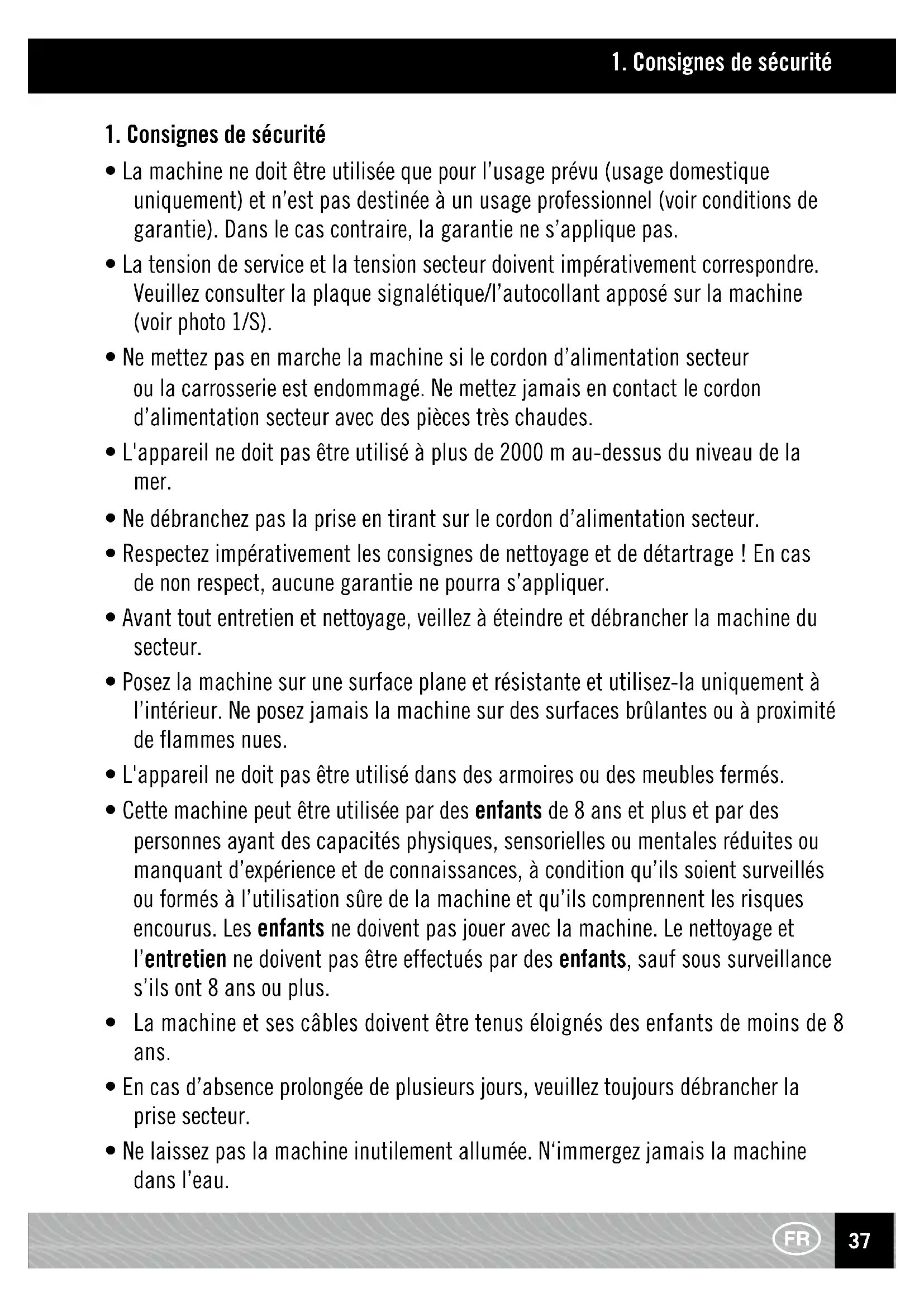 - La machine ne doit être utilisée que pour l’usage prévu (usage domestique uniquement) et n’est pas destinée à un usage professionnel (voir conditions de garantie). Dans le cas contraire, la garantie ne s’applique pas.