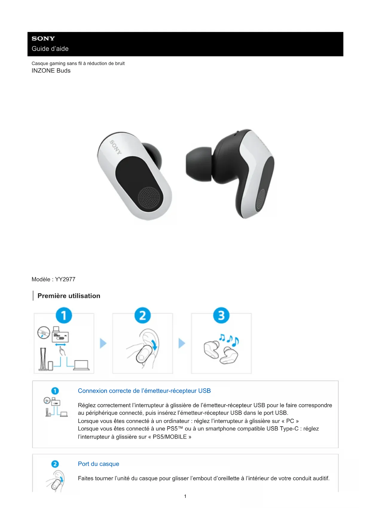 Guide d’aide Casque gaming sans fil à réduction de bruit INZONE Buds Modèle : YY2977 Première utilisation Connexion correcte de l’émetteur-récepteur USB Réglez correctement l’interrupteur à glissière de l’émetteur-récepteur USB pour le faire correspondre au périphérique connecté, puis insérez l’émetteur-récepteur USB dans le port USB. Lorsque vous êtes connecté à un ordinateur : réglez l’interrupteur à glissière sur « PC » Lorsque vous êtes connecté à une PS5™ ou à un smartphone compatible USB Type-C : réglez l’interrupteur à glissière sur « PS5/MOBILE » Port du casque Faites tourner l’unité du casque pour glisser l’embout d’oreillette à l’intérieur de votre conduit auditif. 1Utiliser l’ensemble des fonctions et améliorer les performances Mettez à jour le logiciel du casque et le logiciel de l’ordinateur « INZONE Hub » à la dernière version. Pour plus d’informations sur « INZONE Hub », consultez l’URL suivante : https://www.sony.net/inzonehub-support Pour éviter toute brûlure ou tout dysfonctionnement lorsque le casque est mouillé Informations associées Chargement du casque WF-G700N Utilisation du casque Effleurez le centre du capteur tactile avec le bout de votre index. Gauche : pour commander la fonction antibruit et le mode bruit ambiant : pour allumer/éteindre les micros Droite : pour augmenter le volume (si le volume n’augmente pas lors de l’utilisation du casque, réglez le volume à l’aide du périphérique connecté) : pour réduire le volume Mise en route Utilisation du casque gaming À propos du guidage vocal Accessoires fournis Éléments fournis Remplacement des embouts d’oreillettes Pièces et commandes Emplacement et fonctions des pièces À propos du témoin Port du casque Port du casque 2Modification du mode du casque (mode Bluetooth/mode émetteur-récepteur USB) Utilisation d’une seule unité du casque Fonctionnement du casque À propos du capteur tactile Alimentation/Chargement Chargement Durée de fonctionnement disponible Vérification du niveau de charge restant de la batterie Mise sous tension du casque Mise hors tension du casque Utilisation du casque raccordé à une console de jeux Connexion à un ordinateur, à une PlayStation®5 ou à un smartphone compatible USB Type-C via l’émetteur- récepteur USB Utilisation du casque via l’émetteur-récepteur USB Utilisation du casque raccordé à un périphérique Bluetooth Établissement d’une connexion sans fil avec des périphériques Bluetooth Configuration aisée avec l’application Connexion à l’aide de l’application « Sony | Headphones Connect » Smartphone Android Pairage et connexion à un smartphone Android à l’aide de LE Audio Connexion à un smartphone Android apparié Utilisation du casque via une connexion Bluetooth Communications téléphoniques Réception d’un appel Émission d’un appel Fonctions pour un appel téléphonique Coupure de la connexion Bluetooth (après utilisation) Écoute de musique Écoute de musique à partir d’un périphérique connecté via une connexion Bluetooth Commande du périphérique audio (connexion Bluetooth) 3Coupure de la connexion Bluetooth (après utilisation) À propos de 360 Reality Audio À propos de la qualité d’une connexion LE Audio Codecs pris en charge Personnalisation du casque Utilisation de « INZONE Hub » Utilisation de « INZONE Hub » Installation de « INZONE Hub » Utilisation de l’application « Sony | Headphones Connect » Utilisation de l’application « Sony | Headphones Connect » Installation de l’application « Sony | Headphones Connect » Accès aux informations de support à partir de l’application « Sony | Headphones Connect » Comment conserver le logiciel à jour (pour une utilisation confortable du casque) Utilisation de la fonction de commande du son ambiant Fonction antibruit Qu’est-ce que la fonction antibruit ? Utilisation de la fonction antibruit Écoute du son ambiant Écoute du son ambiant (mode bruit ambiant) Écoute rapide du son ambiant (mode attention rapide) Informations importantes Précautions Lorsque vous n’utilisez plus le casque Maintenance Pour éviter toute brûlure ou tout dysfonctionnement lorsque le casque est mouillé Lorsque les unités du casque, l’étui de recharge ou l’émetteur-récepteur USB sont mouillés Licences Marques Sites Web d’assistance à la clientèle 4Dépannage Que puis-je faire pour résoudre un problème ? Alimentation/Chargement Impossible de mettre le casque sous tension. Le casque est mis hors tension automatiquement. Le chargement est impossible. La durée de fonctionnement disponible est courte ; la batterie s’épuise rapidement. La durée de chargement est trop longue. Son Aucun son n’est émis, aucun son n’est émis d’un côté, le niveau du son est bas Le son saute fréquemment, un bruit est émis, le son est déformé Impossible d’entendre l’autre personne ou le volume d’appel est bas pendant les appels/L’autre personne ne vous entend pas ou son volume d’appel est bas pendant les appels. Faible qualité du son du périphérique connecté via Bluetooth. Les effets de la fonction antibruit sont insuffisants. La façon dont le son résonne change lorsque la fonction antibruit est activée. Raccord Le pairage est impossible. Impossible d’établir une connexion avec une console de jeu (PC, PlayStation®5 ou smartphone compatible USB Type-C) via l’émetteur-récepteur USB. Impossible d’établir une connexion avec un périphérique Bluetooth. La vidéo reçue via le Wi-Fi d’un smartphone est perturbée ou ne peut pas être connectée. Fonctionnement Le casque ne peut pas être utilisé. Autres Les embouts d’oreillettes sont endommagés ou ont été perdus. En cas de douleur à l’oreille. Réinitialisation ou initialisation du casque Réinitialisation du casque Initialisation du casque pour restaurer les paramètres d’usine 55-052-425