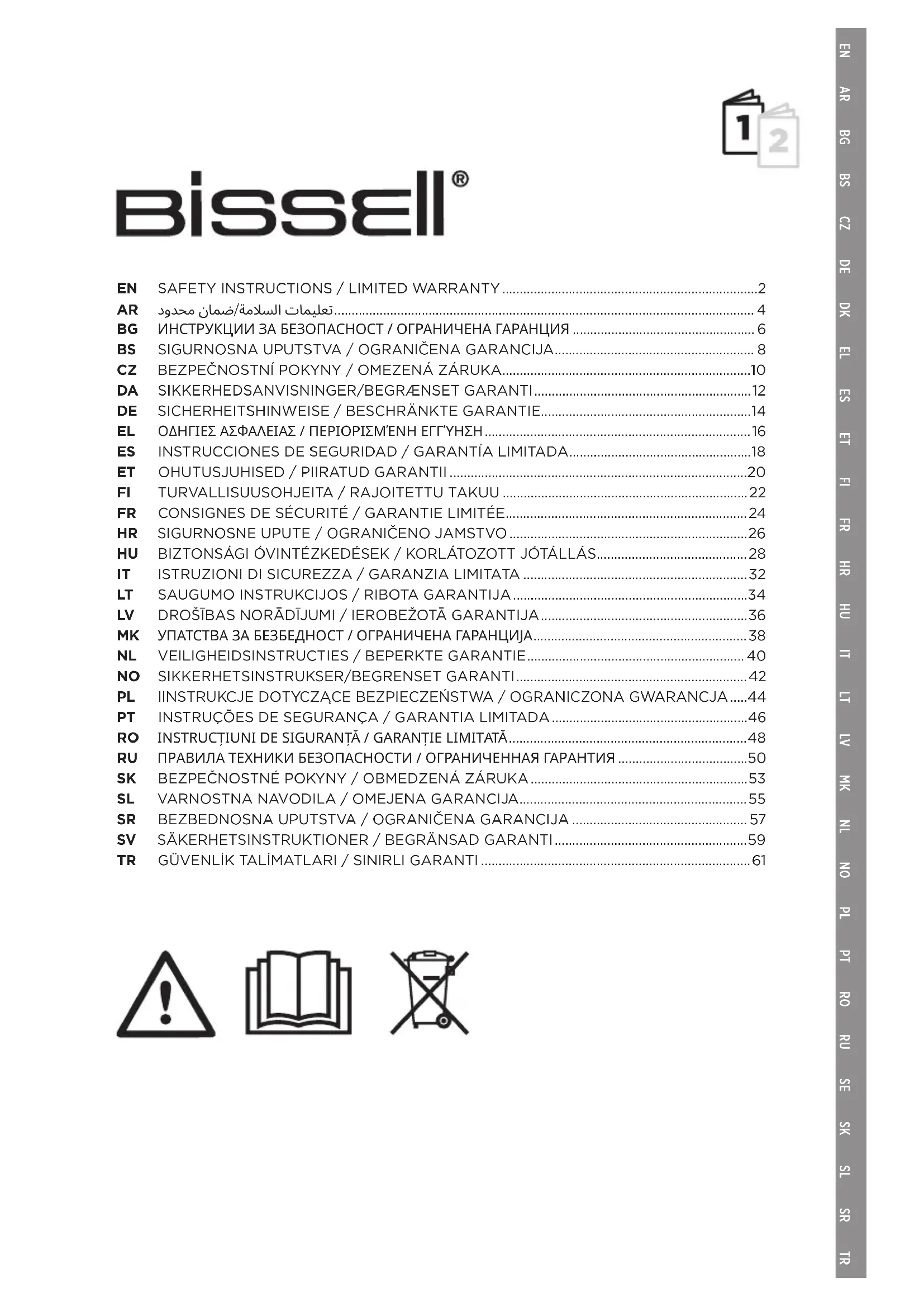 - Ne pas utiliser l'appareil sans les filtres. LISEZ ATTENTIVEMENT TOUTES LES INSTRUCTIONS AVANT D’UTILISER VOTRE APPAREIL. Lors de l’utilisation de tout appareil électrique, des précautions élémentaires doivent être respectées, notamment les suivantes: SYMBOLE EXPLICATION Attention. Lire le mode d'emploi. Risque d'incendie. Risque de choc électrique. Stocker à l'intérieur. Débrancher l'alimentation électrique avant l'entretien. SYMBOLE EXPLICATION Protection contre les pièces en mouvement. Risque de démarrage automatique. Utiliser de l'eau chaude, jusqu'à 60°C. Verrouiller. Ne pas exposer au gel. Utiliser uniquement des formules de nettoyage BISSELL® compatibles avec cette machine. SYMBOLE EXPLICATION Vérifier l'étiquette du fabricant avant de nettoyer le textile. «W» sur l'étiquette, comme sur l'illustration, signifie que vous pouvez utiliser votre nettoyeur. Ne pas trop mouiller les moquettes. Utiliser uniquement sur les moquettes humidifiées par le processus de nettoyage. Ce produit contient des matériaux recyclables. Ne pas jeter ce produit avec les ordures ménagères. Veuillez contacter votre municipalité locale pour connaître le point de collecte le plus proche. FRglobal.BISSELL.com 25 Garantie limitée Cette garantie limitée ne s'applique qu'en dehors des États-Unis, du Canada, de l'Australie, de la Nouvelle-Zélande et de la Chine continentale. Elle est fournie par BISSELL International Trading Company B.V. («BISSELL») et vous accorde des droits spécifiques. Elle constitue un avantage supplémentaire s'ajoutant à vos autres droits en vertu de vos lois locales, qui peuvent varier d'un pays à l'autre. Vous pouvez en savoir plus sur vos droits et recours légaux en contactant votre service local de conseil à la clientèle. Rien dans la présente garantie ne remplacera ni ne restreindra vos droits ou recours légaux. Si vous avez besoin d'instructions supplémentaires concernant cette garantie ou si vous avez des questions concernant ce qu'elle peut couvrir, veuillez contacter le service à la clientèle de BISSELL ou votre distributeur local. Cette garantie est donnée au propriétaire actuel du produit avec le reçu de vente original. Le reçu de vente original doit inclure le(s) produit(s) acheté(s), la date d'achat et le pays dans lequel il(s) a/ont été acheté(s). Vous devez être en mesure de prouver la date d'achat et le pays où le produit a été acheté pour soumettre une réclamation au titre de cette garantie. Vous bénéficierez de la garantie applicable au pays où votre produit a été acheté à l'origine, comme indiqué sur le reçu de vente original. Si vous utilisez le produit en dehors du pays où il a été acheté, votre garantie peut être jugée nulle et non avenue à la seule discrétion de BISSELL. Il peut être nécessaire d'obtenir certaines de vos informations personnelles, telles qu'une adresse postale, afin de remplir les conditions de la présente garantie. Toutes les données personnelles seront traitées conformément à la Politique de confidentialité de BISSELL, qui peut être consultée à l'adresse global.BISSELL.com/Privacy-Policy. Garantie limitée de deux ans Pendant deux ans à compter de la date d'achat par l'acheteur d'origine, sous réserve des EXCEPTIONS ET EXCLUSIONS* stipulées ci-dessous, BISSELL réparera ou remplacera (avec des composants ou produits neufs, remis à neuf, peu utilisés ou refabriqués), à la discrétion de BISSELL, gratuitement, toute pièce ou produit défectueux ou défaillant. BISSELL recommande de conserver l'emballage d'origine et la preuve d'achat originale mentionnant la date d'achat et le pays où l'achat a été effectué pendant la durée de la période de garantie au cas où vous souhaiteriez la faire valoir. Conserver l'emballage d'origine facilitera tout réemballage et tout transport nécessaires, mais n'est pas une condition de la garantie. Si votre produit est remplacé par BISSELL dans le cadre de cette garantie, alors le nouvel article bénéficiera du reste de la durée de la présente garantie (calculée à partir de la date d'achat d'origine). La durée de cette garantie ne saurait être prolongée, que votre produit soit réparé ou remplacé ou non. *Exceptions et exclusions aux termes de la garantie Cette garantie s'applique aux produits utilisés à des fins domestiques personnelles et non commerciales ou de location. Les composants et accessoires consommables tels que les filtres, les courroies, les coques, les réservoirs d'eau, les bandes de raclage, les brosses et les coussinets, qui doivent être remplacés ou entretenus par l'utilisateur de temps à autre, ne sont pas couverts par la présente garantie. Cette garantie ne s'applique pas à tout défaut découlant d'une usure normale, y compris, mais sans s'y limiter, le raccourcissement du temps de décharge de la batterie en raison du vieillissement ou de l'utilisation. Les dommages ou les dysfonctionnements causés par l'utilisateur ou tout tiers, qu'ils résultent d'un accident, d'une négligence, d'un abus ou de toute autre utilisation non conforme au guide de l'utilisateur, ne sont pas couverts par la présente garantie. Une réparation (ou une tentative de réparation) non autorisée peut annuler cette garantie, que cette réparation/tentative ait causé ou non des dommages. Le fait de retirer ou d'altérer l'étiquette de caractéristiques du produit ou de la rendre illisible annulera cette garantie. Sauf dans les cas indiqués ci-dessous, BISSELL et ses distributeurs ne sont pas responsables de toute perte ou de tout dommage qui n'est pas prévisible ou de tout dommage accidentel ou consécutif de quelconque nature associé à l'utilisation de ce produit, y compris, sans s'y limiter, toute perte de profit, toute perte d'activité, toute interruption d'activité, toute perte d'opportunité, toute détresse, tout désagrément ou toute déception. Sauf comme indiqué ci-dessous, la respon