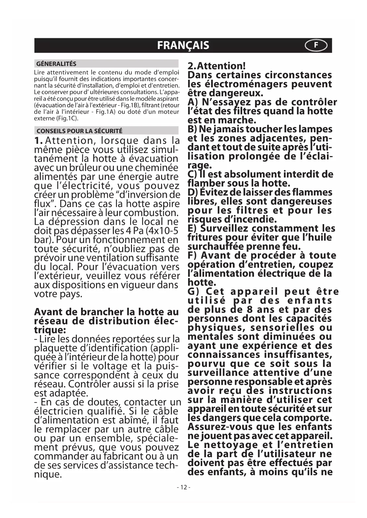Lire attentivement le contenu du mode d’emploi puisqu’il fournit des indications importantes concer- nant la sécurité d’installation, d’emploi et d’entretien. Le conserver pour d’ ultérieures consultations. L’appa- reil a été conçu pour être utilisé dans le modèle aspirant (évacuation de l’air à l’extérieur - Fig.1B), filtrant (retour de l’air à l’intérieur - Fig.1A) ou doté d’un moteur externe (Fig.1C).