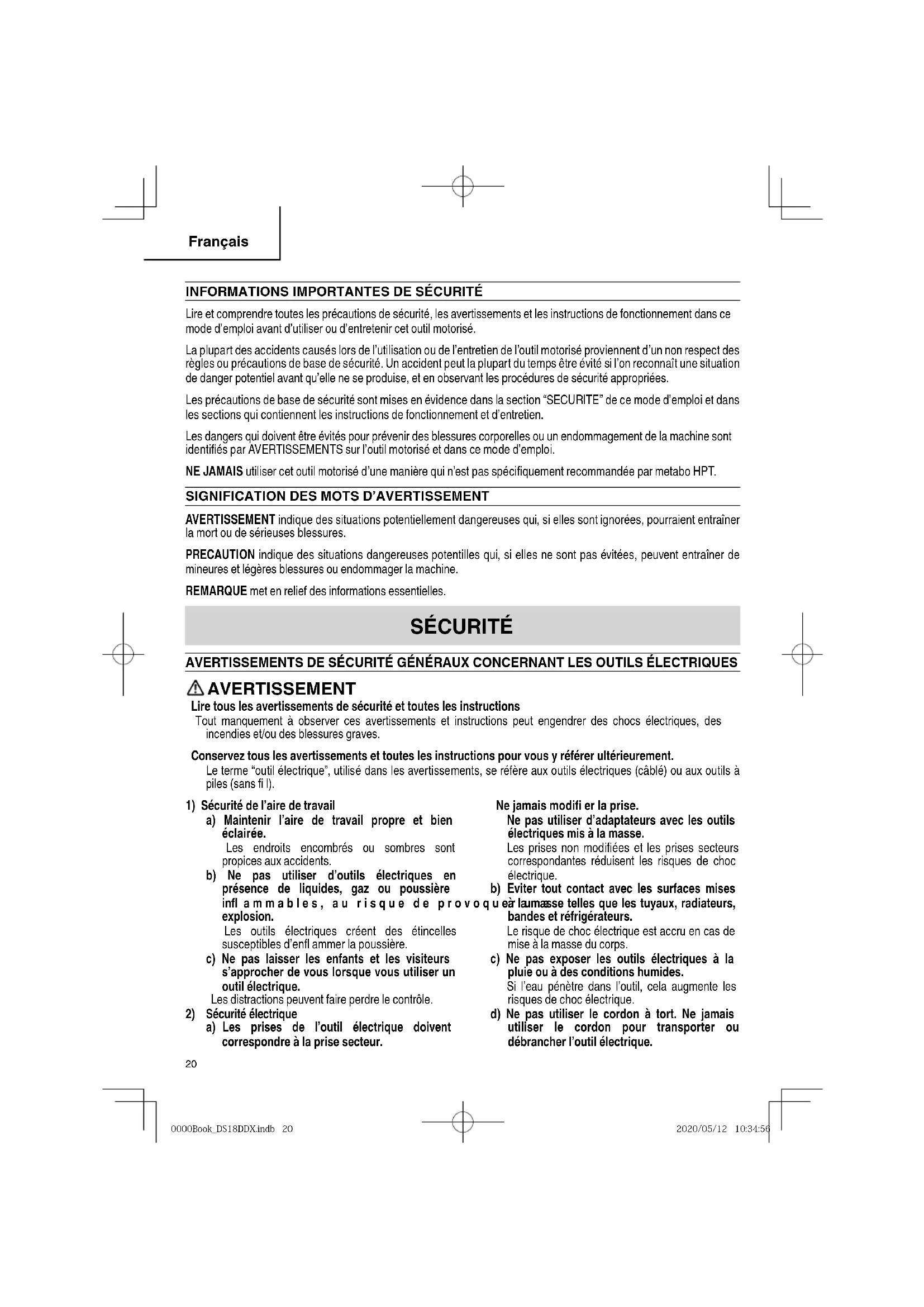English 0000BookDS18DDX.indb190000BookDS18DDX.indb19 2020/05/1210:34:562020/05/1210:34:56INFORMATIONS IMPORTANTES DE SÉCURITÉ Lire et comprendre toutes les précautions de sécurité, les avertissements et les instructions de fonctionnement dans ce mode d’emploi avant d’utiliser ou d’entretenir cet outil motorisé. La plupart des accidents causés lors de l’utilisation ou de l’entretien de l’outil motorisé proviennent d’un non respect des règles ou précautions de base de sécurité. Un accident peut la plupart du temps être évité si l’on reconnaît une situation de danger potentiel avant qu’elle ne se produise, et en observant les procédures de sécurité appropriées. Les précautions de base de sécurité sont mises en évidence dans la section “SECURITE” de ce mode d’emploi et dans les sections qui contiennent les instructions de fonctionnement et d’entretien. Les dangers qui doivent être évités pour prévenir des blessures corporelles ou un endommagement de la machine sont identifi és par AVERTISSEMENTS sur l’outil motorisé et dans ce mode d’emploi. NE JAMAIS utiliser cet outil motorisé d’une manière qui n’est pas spécifi quement recommandée par metabo HPT.