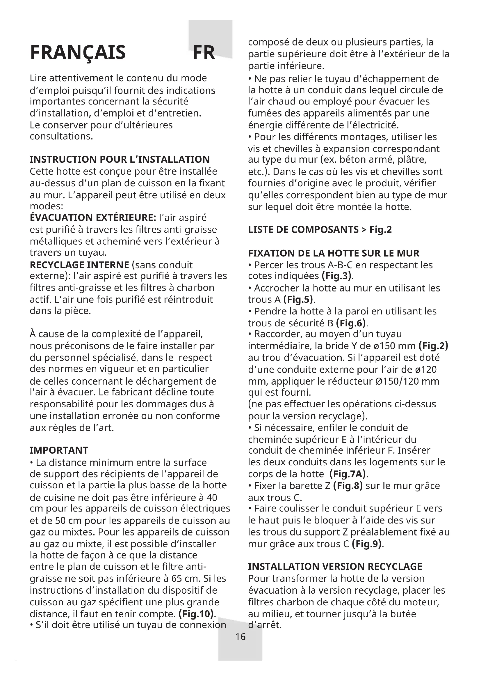 Cette hotte est conçue pour être installée au-dessus d’un plan de cuisson en la xant au mur. L’appareil peut être utilisé en deux modes: ÉVACUATION EXTÉRIEURE: l’air aspiré est purié à travers les ltres anti-graisse métalliques et acheminé vers l’extérieur à travers un tuyau. RECYCLAGE INTERNE (sans conduit externe): l’air aspiré est purié à travers les ltres anti-graisse et les ltres à charbon actif. L’air une fois purié est réintroduit dans la pièce. À cause de la complexité de l’appareil, nous préconisons de le faire installer par du personnel spécialisé, dans le respect des normes en vigueur et en particulier de celles concernant le déchargement de l’air à évacuer. Le fabricant décline toute responsabilité pour les dommages dus à une installation erronée ou non conforme aux règles de l’art. IMPORTANT