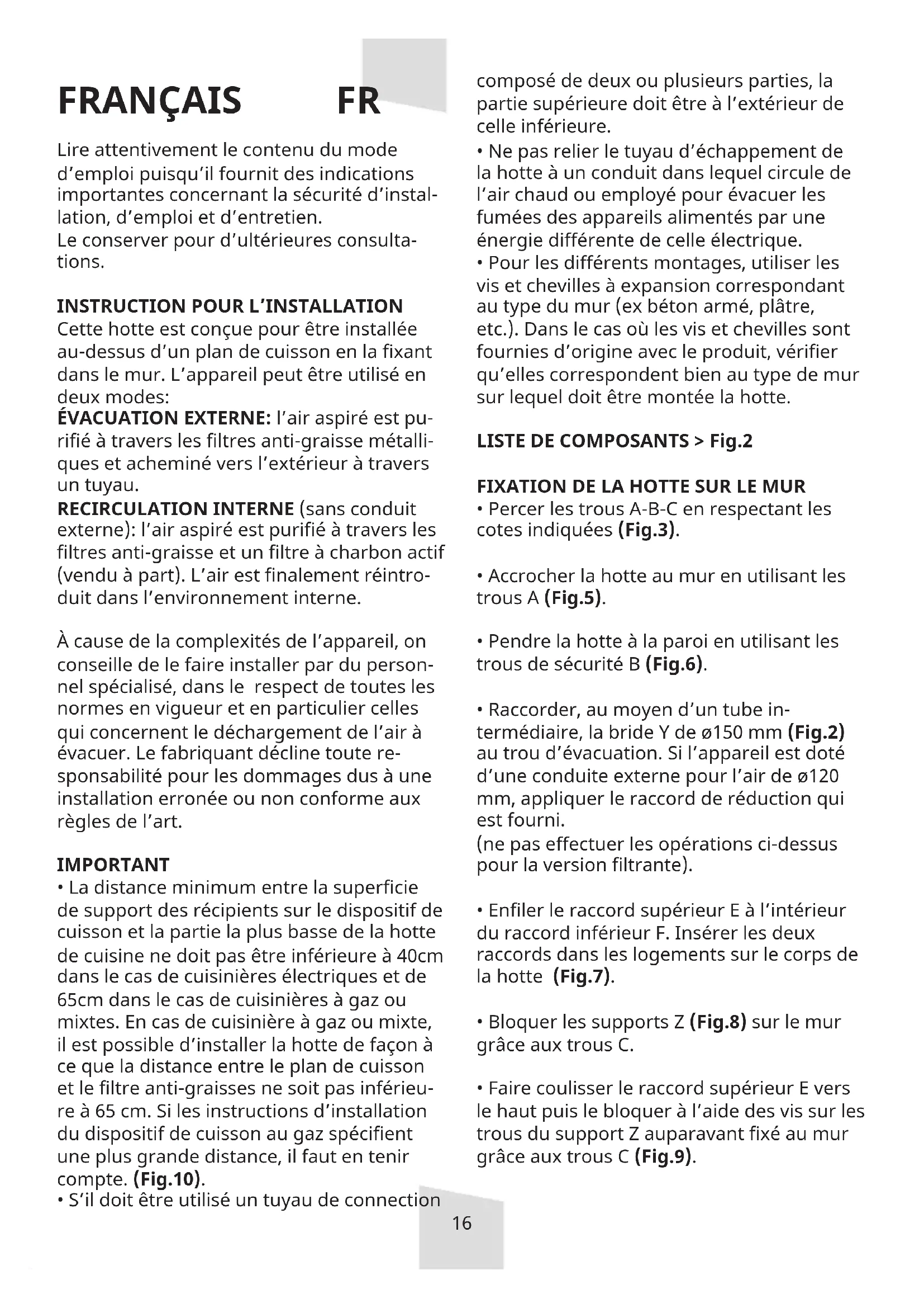 - La distance minimum entre la supercie de support des récipients sur le dispositif de cuisson et la partie la plus basse de la hotte de cuisine ne doit pas être inférieure à 40cm dans le cas de cuisinières électriques et de 65cm dans le cas de cuisinières à gaz ou mixtes. En cas de cuisinière à gaz ou mixte, il est possible d’installer la hotte de façon à ce que la distance entre le plan de cuisson et le ltre anti-graisses ne soit pas inférieu- re à 65 cm. Si les instructions d’installation du dispositif de cuisson au gaz spécient une plus grande distance, il faut en tenir compte. (Fig.10).