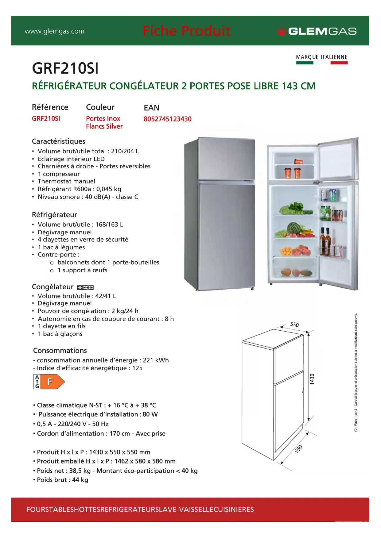 www.glemgas.com Fiche Produit V0 - Page 1 sur 2 - Caractéristiques et présentation sujettes à modifications sans préavis. Consommations - consommation annuelle d’énergie : 221 kWh- Indice d'efficacité énergétique : 125• Classe climatique N-ST : + 16 °C à + 38 °C