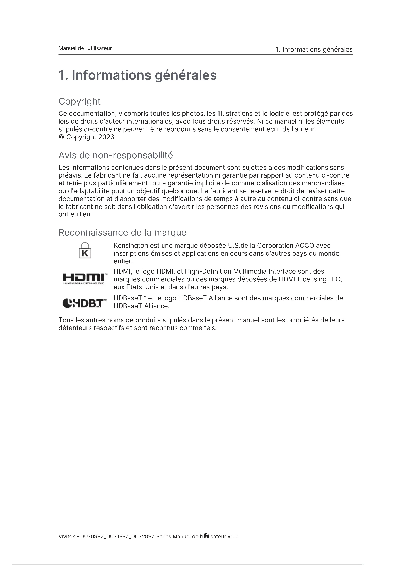 Copyright Ce documentation, y compris toutes les photos, les illustrations et le logiciel est protégé par des lois de droits d'auteur internationales, avec tous droits réservés. Ni ce manuel ni les éléments stipulés ci-contre ne peuvent être reproduits sans le consentement écrit de l'auteur. © Copyright 2023 Avis de non-responsabilité Les informations contenues dans le présent document sont sujettes à des modifications sans préavis. Le fabricant ne fait aucune représentation ni garantie par rapport au contenu ci-contre et renie plus particulièrement toute garantie implicite de commercialisation des marchandises ou d'adaptabilité pour un objectif quelconque. Le fabricant se réserve le droit de réviser cette documentation et d'apporter des modifications de temps à autre au contenu ci-contre sans que le fabricant ne soit dans l'obligation d'avertir les personnes des révisions ou modifications qui ont eu lieu. Reconnaissance de la marque Kensington est une marque déposée U.S.de la Corporation ACCO avec inscriptions émises et applications en cours dans d'autres pays du monde entier. HDMI, le logo HDMI, et High-Definition Multimedia Interface sont des marques commerciales ou des marques déposées de HDMI Licensing LLC, aux Etats-Unis et dans d'autres pays. HDBaseT™ et le logo HDBaseT Alliance sont des marques commerciales de HDBaseT Alliance. Tous les autres noms de produits stipulés dans le présent manuel sont les propriétés de leurs détenteurs respectifs et sont reconnus comme tels.6
