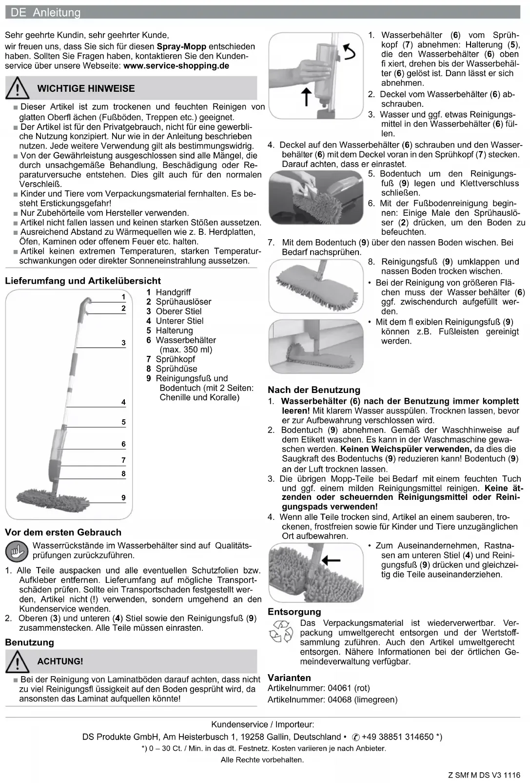 Z SMf M DS V3 1116FR Mode d'emploi Service après-vente/importateur : DS Produkte GmbH, Am Heisterbusch 1, 19258 Gallin, Allemagne • ✆ +49 38851 314650 *) *) Prix d‘un appel vers le réseau fi xe allemand. Coût variable selon le prestataire. Tous droits réservés. Chère cliente, cher client, Nous vous félicitons d’avoir fait l’acquisition de ce balai vapori- sateur. Pour toute question, contactez le service après-vente à partir de notre site Internet : www.service-shopping.de REMARQUES IMPORTANTES ■ Cet article sert au nettoyage sec et humide de surfaces lisses (sols, escaliers, etc.). ■ L’article est conçu pour un usage exclusivement domestique, non professionnel. Il doit être utilisé uniquement tel qu’indi- qué dans le présent mode d’emploi. Toute autre utilisation est considérée comme non conforme. ■ Tout défaut imputable à une utilisation non conforme, à une détérioration ou à des tentatives de réparation est exclu de la garantie. L’usure normale est également exclue de la garantie. ■ Ne laissez pas les emballages à la portée des enfants ou des animaux. Risque de suffocation ! ■ Utilisez uniquement les accessoires du fabricant. ■ Ne faites pas tomber l’article et ne lui faites pas subir de chocs violents. ■ Assurez-vous de le maintenir à une distance suffi sante de toute source de chaleur, comme par ex. des plaques de cuisson, d’un four, d’une cheminée ou de toute fl amme ouverte, etc. ■ N’exposez pas l’article à des températures extrêmes, à de fortes variations de température, ni au rayonnement direct du soleil. Composition et vue générale de l’article 1 Poignée de préhension 2 Gâchette du pistolet 3 Manche supérieur 4 Manche inférieur 5 Support 6 Réservoir d’eau (max. 350 ml) 7 Tête de vaporisation 8 Buse de vaporisation 9 Pied de nettoyage et lingette (avec 2 côtés : chenille et corail) Avant la première utilisation Les résidus d’eau dans le réservoir d’eau proviennent des tests de qualité effectués.
