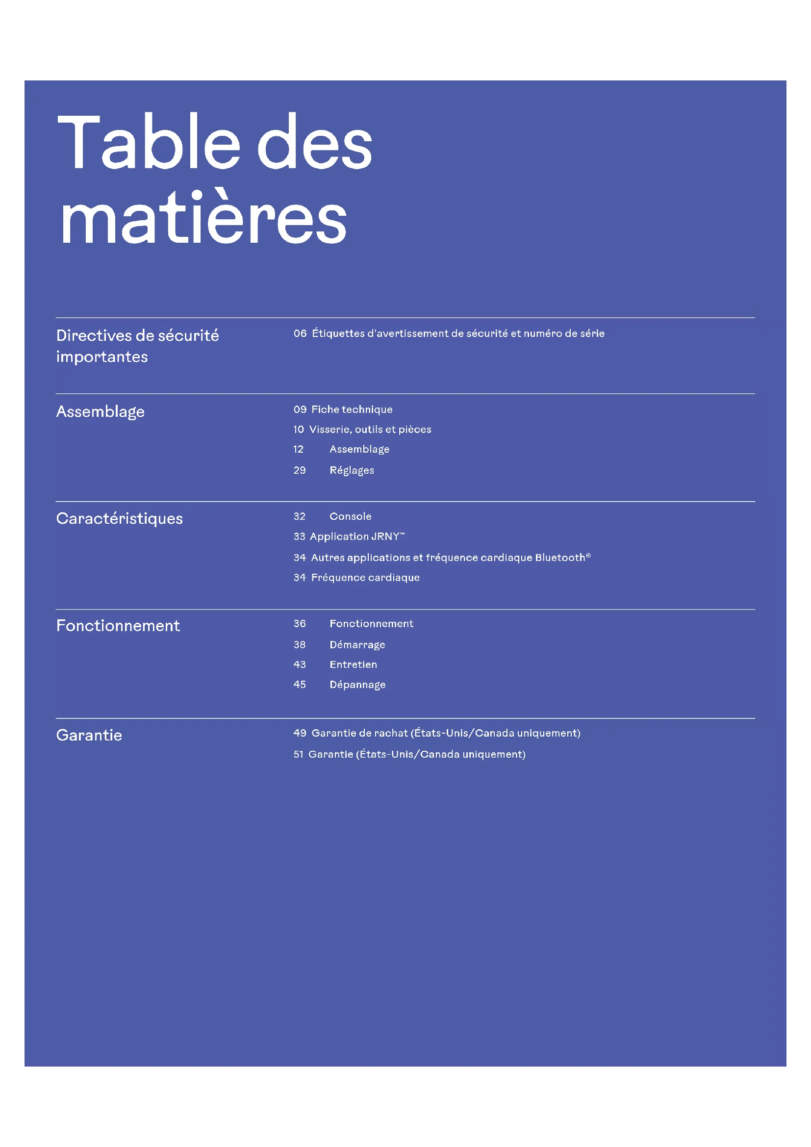 Nom de la section Table des matières Directives de sécurité importantes 06 Étiquettes d’avertissement de sécurité et numéro de série Assemblage 09 Fiche technique 10 Visserie, outils et pièces 12 Assemblage 29 Réglages Caractéristiques 32 Console 33 Application JRNY™ 34 Autres applications et fréquence cardiaque Bluetooth® 34 Fréquence cardiaque Fonctionnement 36 Fonctionnement 38 Démarrage 43 Entretien 45 Dépannage Garantie 49 Garantie de rachat (États-Unis/Canada uniquement) 51 Garantie (États-Unis/Canada uniquement)Guide du propriétaire 3 Informations sur l’achat Guide du propriétaire 3 Pour valider la prise en charge de la garantie, veuillez conserver votre preuve d’achat originale et enregistrer les détails suivants: Numéro de série _____________________________________ Date d’achat _____________________________________ Achat depuis les États-Unis/le Canada: Pour enregistrer la garantie de votre produit, allez à www.bowflex.com/register ou téléphonez au 1-800-605–3369. Achat hors des États-Unis et du Canada: Pour enregistrer la garantie de votre produit, communiquez avec un distributeur local. Pour tout problème ou question concernant votre appareil ou sa garantie, veuillez communiquer avec votre distributeur local. Pour trouver un distributeur dans votre localité, allez à https://global.bowflex.com BowFlex Inc., 5415 Centerpoint Parkway, Groveport, OH 43125 USA, www.bowflex.com - service à la clientèle: Amérique du Nord (800) 605-3369, cs@bowflex.com | BowFlex (Shanghai) Fitness Equipments Co, Ltd, Room 1701 &1702, 1018 Changning Road, Changning District, Shanghai, China 200042, www.bowflex.cn - 86 21 6115 9668 | hors des États-Unis https://global.bowflex.com | Imprimé en Chine | © 2023 BowFlex Inc. | BowFlex, le logo BowFlex, Schwinn, Max Trainer et JRNY sont des marques de commerce appartenant à BowFlex Inc. ou utilisées en vertu d’une licence par BowFlex Inc. et enregistrées ou autrement protégées en common law aux États-Unis et dans d’autres pays. Google Play™ est une marque de ses propriétaires respectifs. Apple et le logo Apple sont des marques commerciales de Apple Inc., enregistrées aux États-Unis et dans d’autres pays. App Store est une marque de service d’Apple Inc. Le mot de la marque et les logos Bluetooth® sont des marques de commerce déposées appartenant à Bluetooth SIG, Inc., et utilisées par BowFlex Inc. en vertu d’une licence. Les autres marques de commerce sont la propriété de leur détenteur respectif. Manuel traduit de l'anglais Scannez le code QR pour télécharger l’application JRNY et commencez dès aujourd’hui.Nom de la section 4 Guide du propriétaire Important Sécurité DirectivesGuide du propriétaire 5 Directives de sécurité importantes Lorsque vous utilisez un appareil électrique, des précautions de base doivent toujours être prises, y compris ce qui suit. Cette icône signale une situation potentiellement dangereuse qui, si elle n’est pas évitée, peut entraîner la mort ou des blessures graves. Veuillez respecter les avertissements suivants: Lisez les étiquettes d’avertissement apposées sur l’appareil. Lisez attentivement et assimilez les instructions d’assemblage. Lisez attentivement et assimilez les instructions d’assemblage. Prendre connaissance du manuel dans son intégralité. Conservez le manuel pour consultation future.