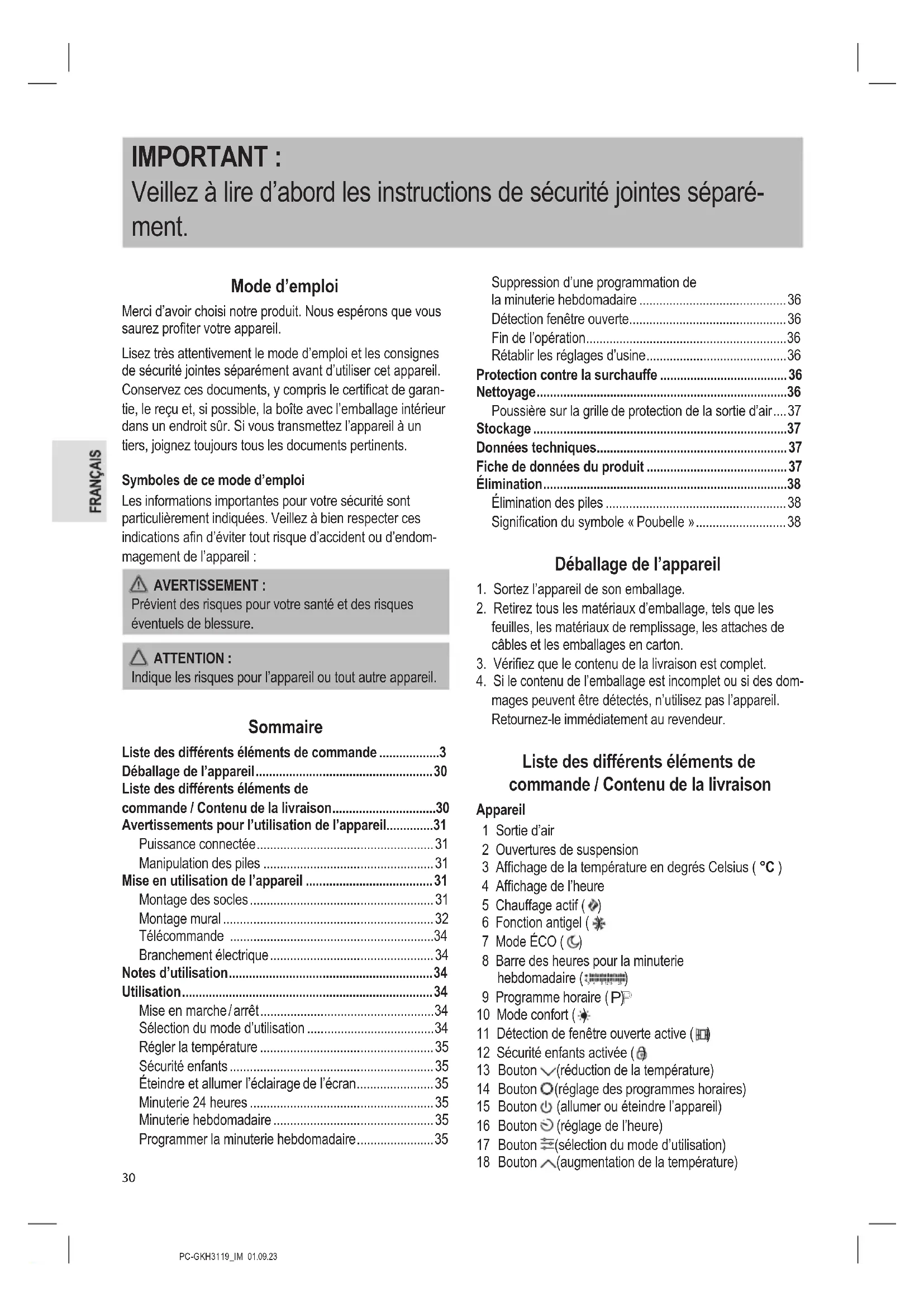 - Liste des différents éléments de commande / Contenu de la livraison p. 30