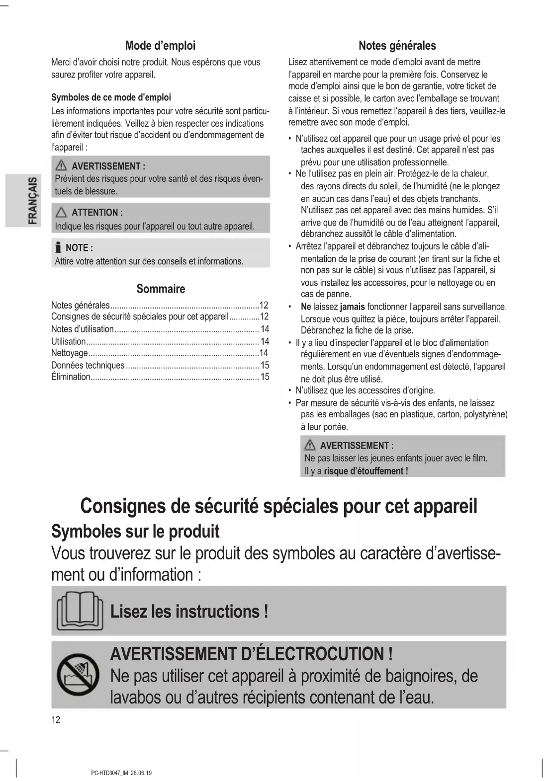 Ne pas laisser les jeunes enfants jouer avec le lm. Il y a risque d’étouffement ! Consignes de sécurité spéciales pour cet appareil Symboles sur le produit Vous trouverez sur le produit des symboles au caractère d’avertisse- ment ou d’information : Lisez les instructions ! AVERTISSEMENT D’ÉLECTROCUTION ! Ne pas utiliser cet appareil à proximité de baignoires, de lavabos ou d’autres récipients contenant de l’eau.13 PC-HTD3047_IM 26.06.19