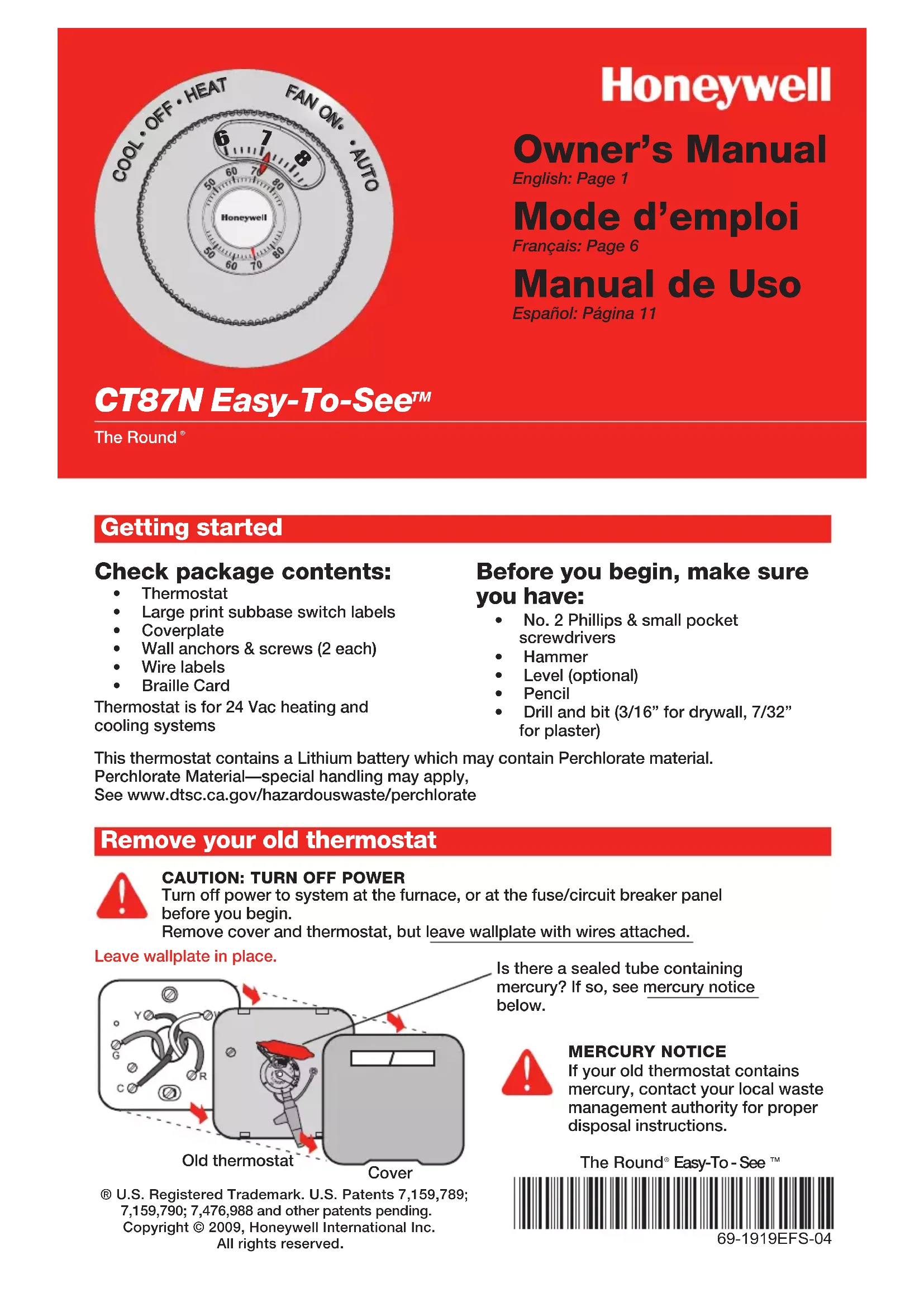 Owner’s Manual English: Page 1 Mode d’emploi Français: Page 6 Manual de Uso Español: Página 11Ancien thermostatLaisserenplacelaplaquemurale. L’ancien thermostat comporte-t-il un tube scellé contenant du mercure? Si c’est le cas, lire l’avis sur le mercure ci-dessous.CouvercleMISE EN GARDE : COUPER L’ALIMENTATION ÉLECTRIQUEAvantdecommencer,couperl’alimentationdusystèmeàl’appareildechauffageouautableau de fusibles/disjoncteurs. Retirer le couvercle et le thermostat, mais laisser en placelaplaquemuraleetlesfilssanslesdétacher. Retirer l’ancien thermostat Pour commencer Cethermostatcontientunepileaulithiumquipourraitcontenirduperchlorate.Matériau contenant du perchlorate — des consignes de manipulation spéciales pourraient s'appliquer,prièredeconsulterwww.dtsc.ca.gov/hazardouswaste/perchlorate®MarquedéposéeauxÉ.-U.BrevetsÉ.-U.N 7,159,789; 7,159,790; 7,476,988 et autres brevets en instance. © 2009 Honeywell International Inc. Tous droits réservés.English: Page 1 • Français: Page 6 • Español: Página 11 7 69-1919EFS—04