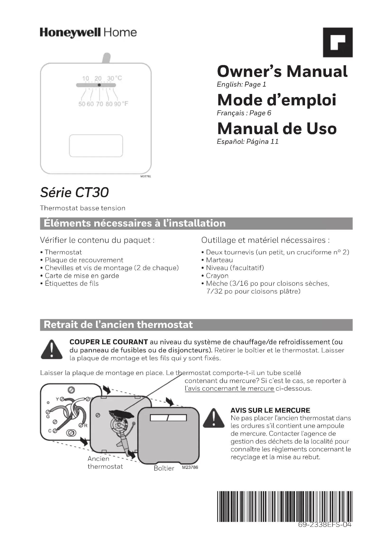 - Off: All systems are off. Temperature setting Adjust to set desired indoor temperature. System off (select models) Move lever to far left to turn off heating system. CAUTION: EQUIPMENT DAMAGE HAZARD (CT31). Do not operate cooling system when outdoor temperature is below 50°F (10°C).M37781 69-2338EFS-04 Série CT30 Thermostat basse tension Owner’s Manual English: Page 1 Mode d’emploi Français : Page 6 Manual de Uso Español: Página 11M23786 Ancien thermostatLaisser la plaque de montage en place. Le thermostat comporte-t-il un tube scellé contenant du mercure? Si c’est le cas, se reporter à l’avis concernant le mercure ci-dessous.Boîtier COUPER LE COURANT au niveau du système de chauffage/de refroidissement (ou du panneau de fusibles ou de disjoncteurs). Retirer le boîtier et le thermostat. Laisser la plaque de montage et les fils qui y sont fixés. Retrait de l’ancien thermostat Éléments nécessaires à l’installation AVIS SUR LE MERCURENe pas placer l'ancien thermostat dans les ordures s’il contient une ampoule de mercure. Contacter l'agence de gestion des déchets de la localité pour connaître les règlements concernant le recyclage et la mise au rebut.Vérifier le contenu du paquet :• Thermostat• Plaque de recouvrement• Chevilles et vis de montage (2 de chaque)• Carte de mise en garde• Étiquettes de filsOutillage et matériel nécessaires :• Deux tournevis (un petit, un cruciforme n° 2)• Marteau• Niveau (facultatif)• Crayon• Mèche (3/16 po pour cloisons sèches, 7/32 po pour cloisons plâtre) M37781English: Page 1 • Français : Page 6 • Español: Página 11 7 69-2338EFS—04