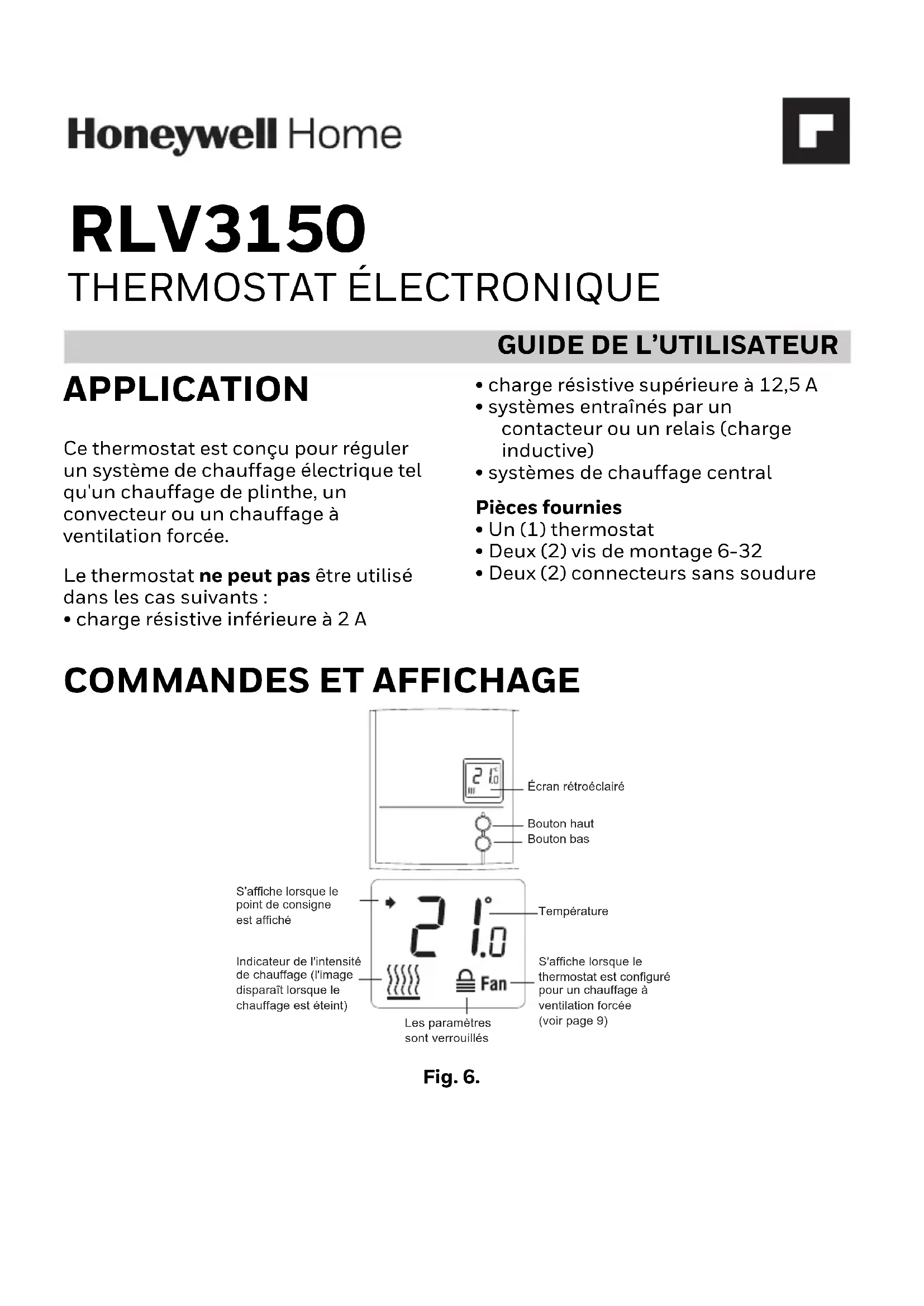 The product should not be disposed of with other household waste. Check for the nearest authorized collection centers or authorized recyclers. The correct disposal of end-of-life equipment will help prevent negative consequences for the environment and human health.RLV3150 © 2021 Resideo Technologies, Inc. All rights reserved. The Honeywell Home trademark is used under license from Honeywell International, Inc. This product is manufactured by Resideo Technologies, Inc. and its affiliates. Tous droits réservés. La marque de commerce Honeywell Home est utilisée avec l’autorisation d’Honeywell International, Inc. Ce produit est fabriqué par Resideo Technologies, Inc. et ses sociétés affiliées. www.resideo.com Resideo Technologies, Inc. 1985 Douglas Drive North, Golden Valley, MN 55422 1-800-468-1502 33-00209EF—05 M.S. Rev. 01-21 | Printed in United StatesGUIDE DE L’UTILISATEUR RLV3150 THERMOSTAT ÉLECTRONIQUE APPLICATION Ce thermostat est conçu pour réguler un système de chauffage électrique tel qu'un chauffage de plinthe, un convecteur ou un chauffage à ventilation forcée. Le thermostat ne peut pas être utilisé dans les cas suivants :