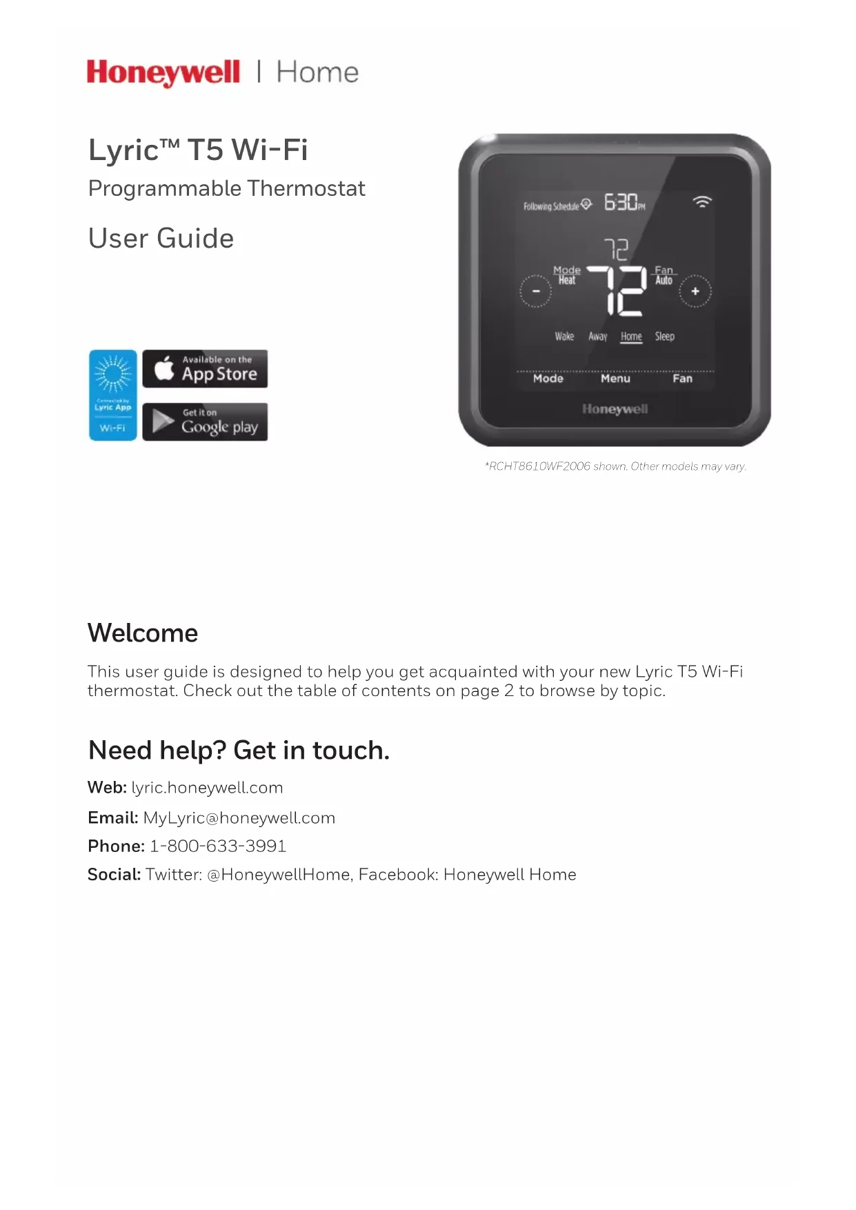 Printed in U.S.A. Home and Building Technologies In the U.S.: Honeywell 1985 Douglas Drive North Golden Valley, MN 55422 http://customer.honeywell.com 33-00231EFS-01Guide de l’utilisateur Thermostat Wi-Fi Lyric™ T5 Thermostat programmable *Représentation du thermostat RCHT8610WF2006. Les autres modèles peuvent varier. Connected by Lyric AppWi-Fi Ce guide de l’utilisateur est conçu pour vous aider à vous familiariser avec votre nouveau thermostat Wi-Fi Lyric T5. Veuillez consulter la table des matières à la page 2 pour effectuer une recherche par sujet. Bienvenue Site Web : lyric.honeywell.com Courriel : MyLyric@honeywell.com Téléphone : 1-800-633-3991 Réseaux sociaux : Twitter: @HoneywellHome, Facebook: Honeywell Home Besoin d’aide? Contactez-nous.2 Caractéristiques du thermostat .......................................................................................... 3 Présentation du thermostat