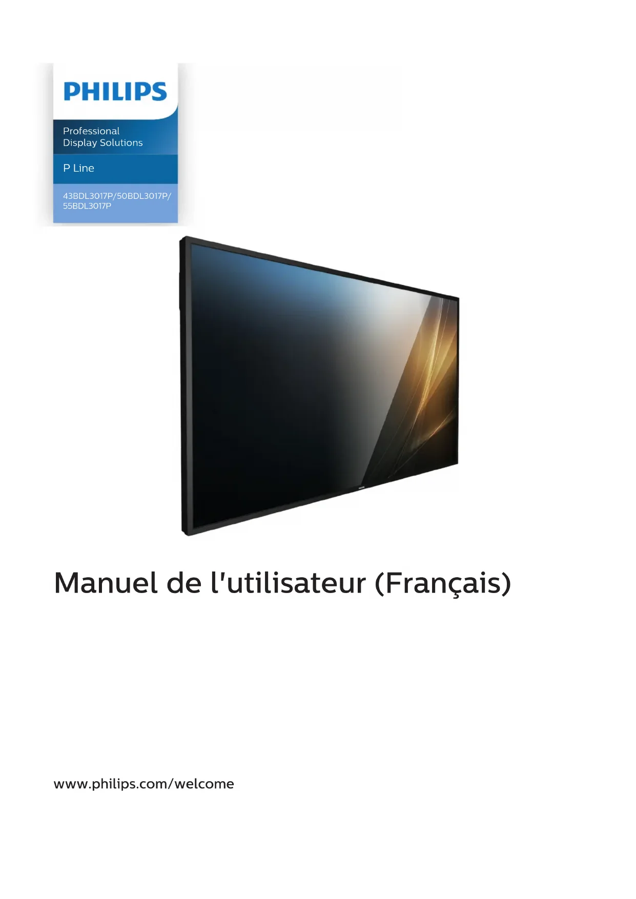 Déchet d’équipement électrique et électronique - DEEE A l’attention des utilisateurs des foyers de l’Union Européenne Cette Marque sur le produit ou sur l’emballage illustre que, sous la Directive Européenne 2012/19/UE gouvernant l’utilisation des équipements électriques et électroniques, ce produit peut ne pas être jeté avec les ordures ménagères. Vous êtes responsable de l'élimination de cet équipement à travers une collection aux déchets d'équipements électriques et électroniques désignés. An de déterminer les emplacements de telles ordures électriques et électroniques, veuillez contacter votre représentant du gouvernement local pour connaitre l’organisation de décharge d’ordure dont dépend votre foyer ou le magasin où vous avez acheté le produit. Attention – Utilisateurs aux Etats-Unis : Débarrassez-vous en accord avec les lois régionales, nationales et fédérales. Pour plus d’informations sur la mise au rebut ou le recyclage, contactez : www.mygreenelectronics.com ou www.eiae.org. Directives de n de vie - Recyclage Votre nouveau Moniteur d'information du public contient plusieurs matériaux qui peuvent être recyclés pour des nouveaux utilisateurs. Débarrassez-vous en accord avec les lois régionales, nationales et fédérales. Déclaration sur la restriction des substances dangereuses (Inde) Ce produit est conforme aux « Règles (de gestion) des déchets électroniques, 2016 » CHAPITRE V, règle 16, sous-règle (1) . Même si les nouveaux équipements électriques et électroniques et leurs composants ou consommables ou leurs pièces ou pièces de rechange ne contiennent pas de plomb, de mercure, de cadmium, de chrome hexavalent, de biphényles polybromés et de polybromodiphényléthers au-delà d’une valeur de concentration maximale de 0,1 % par poids dans les matières homogènes pour le plomb, le mercure, le chrome hexavalent, les biphényles polybromés et les polybromodiphényléthers et de 0,01 % par poids dans les matières homogènes pour le cadmium, sauf exceptions dénies dans l’Annexe 2 des Règles. Déclaration sur les déchets électroniques pour l’Inde Ce symbole sur le produit ou sur son emballage indique qu’il ne doit pas être jeté avec vos ordures ménagères. Il est de votre responsabilité de le déposer dans un centre de collecte ociel des équipements électriques et électroniques usagés en vue de leur recyclage. Le recyclage de vos équipements usagés permet de préserver les ressources naturelles et de s'assurer que ces équipements sont recyclés dans le respect de la santé humaine et de l'environnement. Pour plus d'informations sur les déchets électroniques, veuillez consulter http://www.india.philips.com/about/sustainability/recycling/index.page et pour savoir où vous pouvez déposer vos équipements usagés en vue de leur recyclage en Inde, veuillez contacter les coordonnées indiquées ci- dessous. Numéro de l’assistance téléphonique : 1800-425-6396 (du lundi au samedi, de 9h00 à 17h30) E-mail : india.callcentre@tpv-tech.com43BDL3017P/50BDL3017P/55BDL3017P