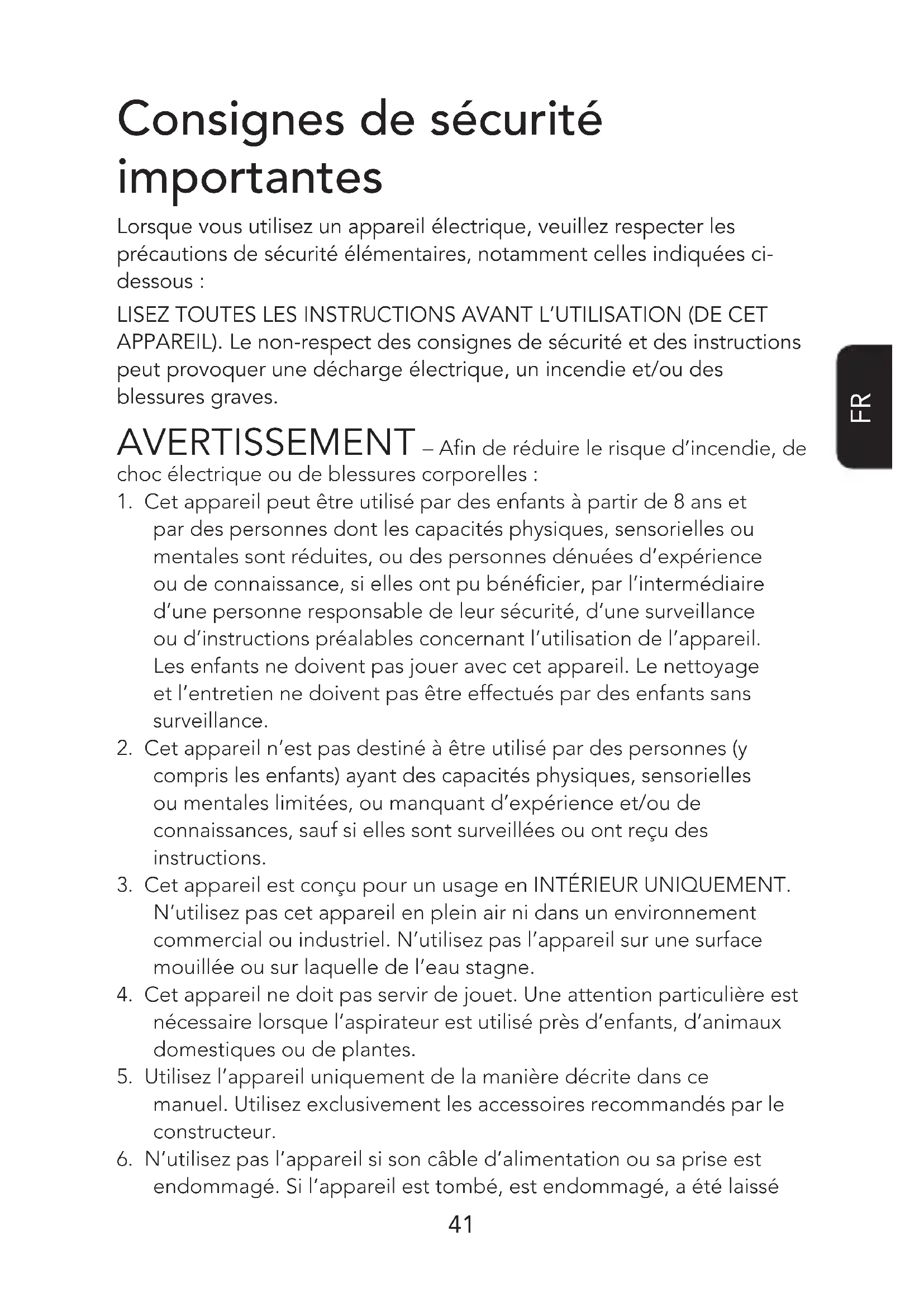 Lorsque vous utilisez un appareil électrique, veuillez respecter les précautions de sécurité élémentaires, notamment celles indiquées ci- dessous: LISEZ TOUTES LES INSTRUCTIONS AVANT L’UTILISATION (DE CET APPAREIL). Le non-respect des consignes de sécurité et des instructions peut provoquer une décharge électrique, un incendie et/ou des blessures graves. AVERTISSEMENT–An de réduire le risque d’incendie, de choc électrique ou de blessures corporelles: