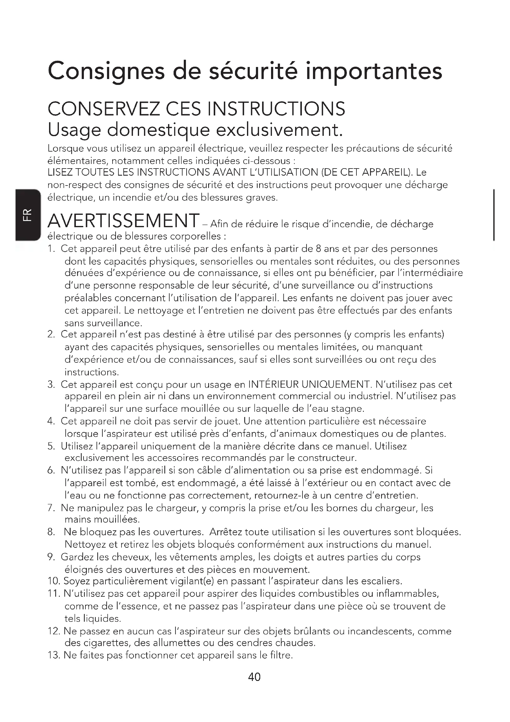 Usage domestique exclusivement. Lorsque vous utilisez un appareil électrique, veuillez respecter les précautions de sécurité élémentaires, notamment celles indiquées ci-dessous: LISEZ TOUTES LES INSTRUCTIONS AVANT L’UTILISATION (DE CET APPAREIL). Le non-respect des consignes de sécurité et des instructions peut provoquer une décharge électrique, un incendie et/ou des blessures graves. AVERTISSEMENT – An de réduire le risque d’incendie, de décharge électrique ou de blessures corporelles: