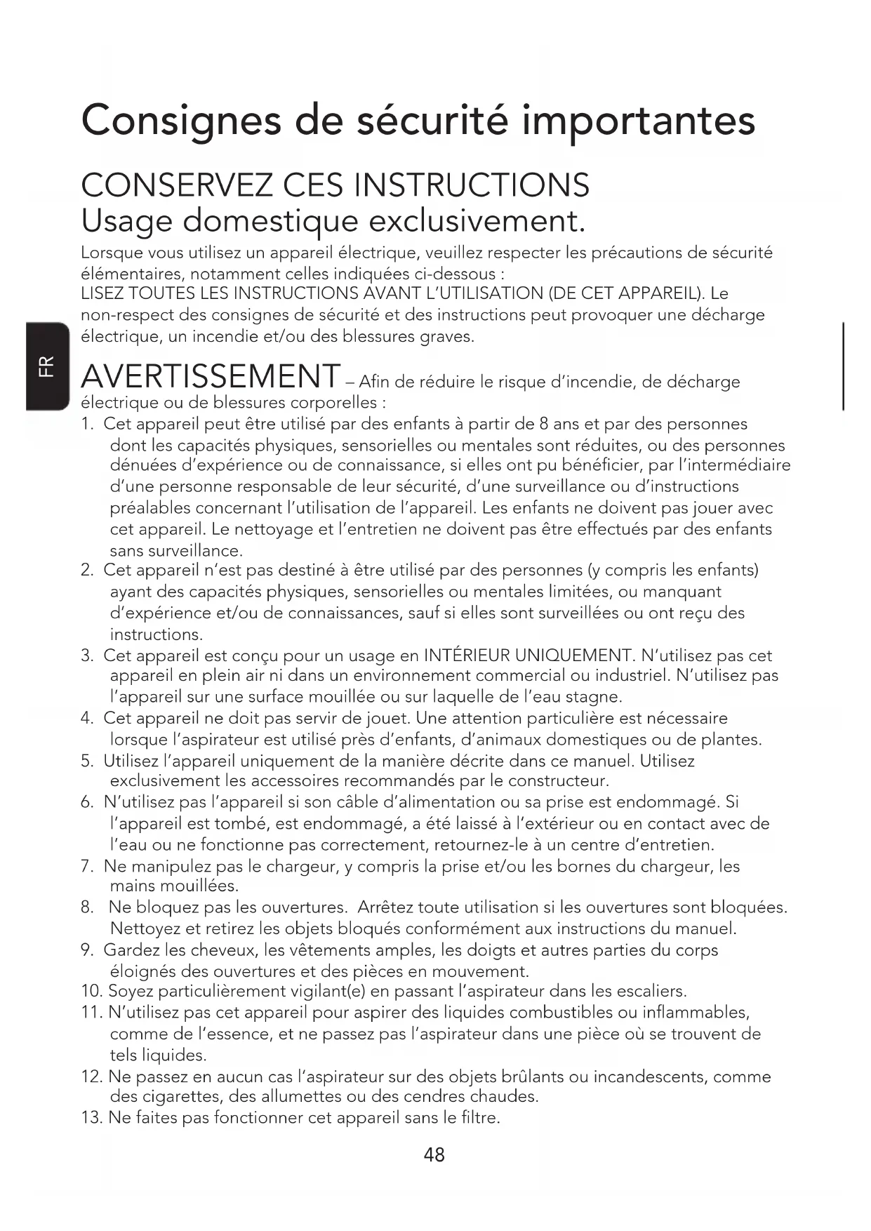 Usage domestique exclusivement. Lorsque vous utilisez un appareil électrique, veuillez respecter les précautions de sécurité élémentaires, notamment celles indiquées ci-dessous: LISEZ TOUTES LES INSTRUCTIONS AVANT L’UTILISATION (DE CET APPAREIL). Le non-respect des consignes de sécurité et des instructions peut provoquer une décharge électrique, un incendie et/ou des blessures graves. AVERTISSEMENT – An de réduire le risque d’incendie, de décharge électrique ou de blessures corporelles: