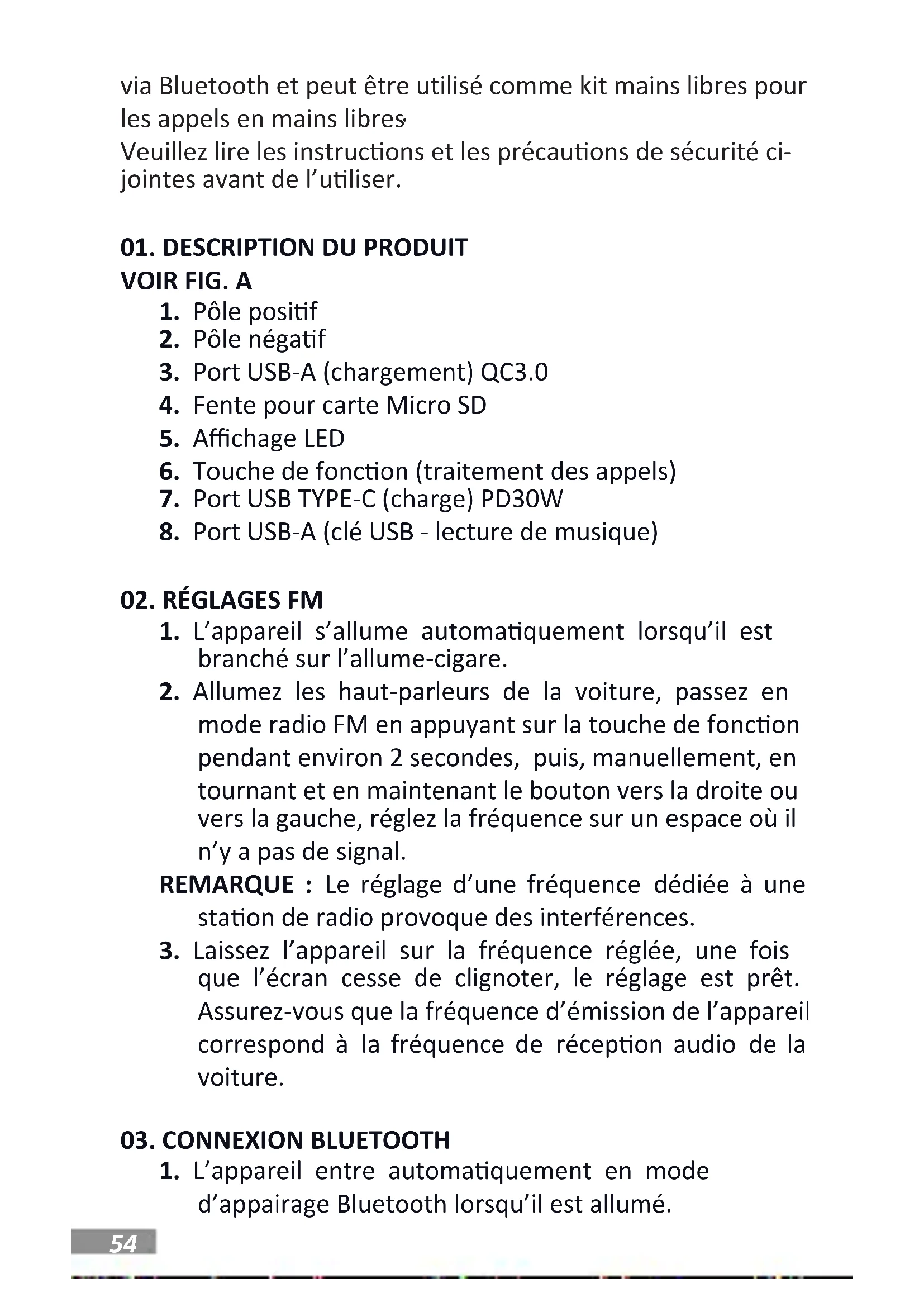 BT version : 5.0 (portée jusqu’à 10m) | Gamme de fréquences FM : 87,5-108,0 MHz | Entrée : 12-24V | Sores : charge - 1 x port USB-A (QC 3.0) - 5V/4.5A, 9V/3A, 12V/2.5A, 1 x port USB Type-C (PD30W) - 5V/3A, 9V/3A, 12V/2.5A, 15V/2A, 20V/1.5A | Sore maximale - 5V/3A | Ports supplémentaires : 1 x USB-A (clé USB), 1 x emplacement pour carte mémoire micro SD (max. 128GB) | Formats audio pris en charge : Formats audio pris en charge : MP3/WMA/APE/WAV/FLAC | Modes de fonconnement : USB/micro SD/BT | Protecon contre les surintensités, les surtensions, les courts-circuits et les surchaues | Dimensions : 75x56x36mm| Poids : 40g | Puissance RF maximale émise dans la gamme de fréquences : 1,11 dBm | Gamme de fréquences : 2,402-2,480 GHz
