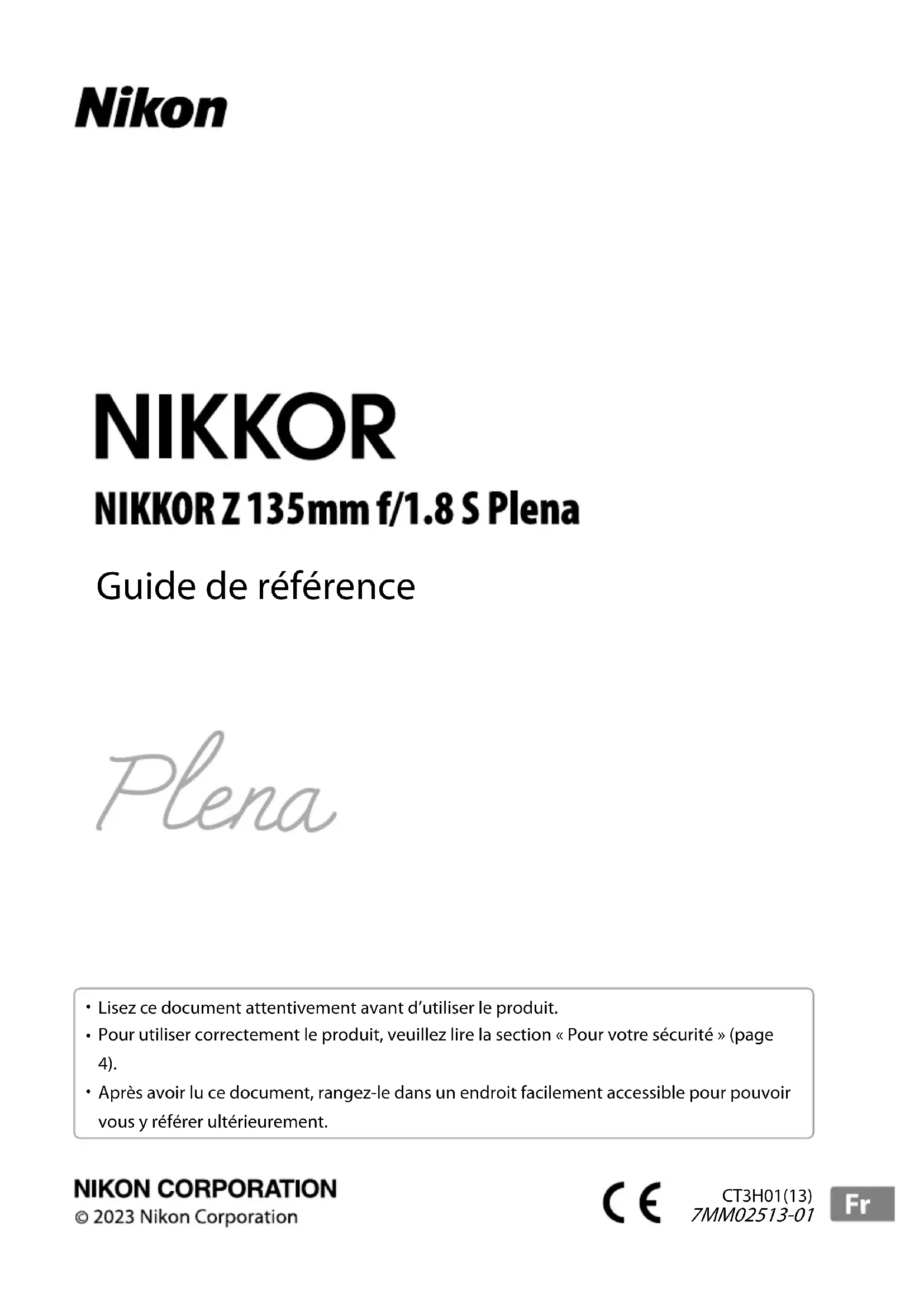 ’assistance AF de l’appareil photo. ・ Pour savoir comment utiliser l’objectif avec des appareils photo équipés d’un illuminateur d’assistance AF intégré, consultez le site ci-dessous. https://downloadcenter.nikonimglib.com/21 Utilisation de l’objectif avec des appareils photo équipés d ’un ash intégré Utilisation de l’objectif avec des appareils phot o équipés d’un ash intégré Des ombres seront visibles sur les photos où la lumière provenant du ash intégré est occultée par l’objectif ou le parasoleil. Retirez le parasoleil avant la prise de vue. Notez toutefois qu’en fonction de la distance au sujet et de la focale de l’objectif, des ombres peuvent être visibles même lorsque le parasoleil est retiré. ・ Pour des informations sur les distances au sujet et les focales auxquelles les ombres n’apparaîtront pas sur les photos prises avec un ash intégré, consultez le site ci- dessous. https://downloadcenter.nikonimglib.com/22 Accessoires Accessoires Accessoires fournis ・ B ouchon d’objectif LC-82B (bouchon avant) ・ Bouchon d’objectif LF-N1 (bouchon arrière) ・ Parasoleil HB-108 ・ Pochette pour objectif CL-C2 D Utilisation de la pochette pour objectif ・ La pochett e est destinée à protéger l’objectif des rayures et non des chutes ou autres chocs physiques. ・ La pochette n’est pas résistante à l’eau. ・ La matière utilisée dans cette pochette peut se décolorer, déteindre, s’étirer, rétrécir ou changer de couleur en cas de frottement ou d’humidité. ・ Retirez la poussière avec un pinceau doux. ・ L’eau et les taches peuvent être retirées de la surface avec un chion doux et sec. N’utilisez pas d’alcool, de benzène, de diluant ou d’autres substances chimiques volatiles. ・ Ne rangez pas le produit dans des lieux exposés à la lumière directe du soleil, à des températures élevées ou à l’humidité. ・ N’utilisez pas la pochette pour nettoyer le moniteur ou les lentilles. ・ Veillez à ce que l’objectif ne tombe pas de la pochette lorsque vous le transportez. Matière : polyester23 Accessoires Autres accessoires compatibles Filtres de 82 mm D Filtres ・ N ’utilisez qu’un seul ltre à la fois. ・ Retirez le parasoleil avant de monter un ltre. Il est également nécessaire de retirer le parasoleil avant de tourner les ltres polarisants circulaires.24 Caractéristiques Caractéristiques Monture Monture Nikon Z Focale 135 mm Ouverture maximale f/1.8 Construction optique 16 éléments en 14 groupes (4 éléments ED, 1 élément asphér ique, 1 lentille en verre SR et des éléments avec traitement méso-amorphe et ARNEO) Angle de champ Format FX : 18°10’ Format DX : 12° Système de mise au point Système de mise au point interne Distance minimale de mise au point (mesurée à partir du repère de plan focal) 0,82 m Rapport de reproduction maximal 0,2× Lamelles de diaphragme 11 (diaphragme circulaire) Plage des ouvertures f/1.8 – 16 Diamètre de xation pour ltre 82 mm (P = 0,75 mm) Dimensions (diamètre maximum × distance jusqu’à l’extrémité de l’objectif depuis le plan d’appui de la monture d’objectif) Environ 98 mm × 139,5 mm25 Caractéristiques Poids Environ 995 g ・ Dans c e document, « format FX » et « FX » font référence à un angle de champ équivalent à celui d’un appareil photo 24×36 (« plein format ») et « format DX » et « DX » à un angle de champ équivalent à celui d’un appareil photo APS-C. ・ Nikon se réserve le droit de modier à tout moment l’apparence, les caractéristiques et les performances de ce produit sans avis préalable.26 Avis Avis Avis pour les clients au Canada CAN ICES-003 (B) / NMB-003 (B)