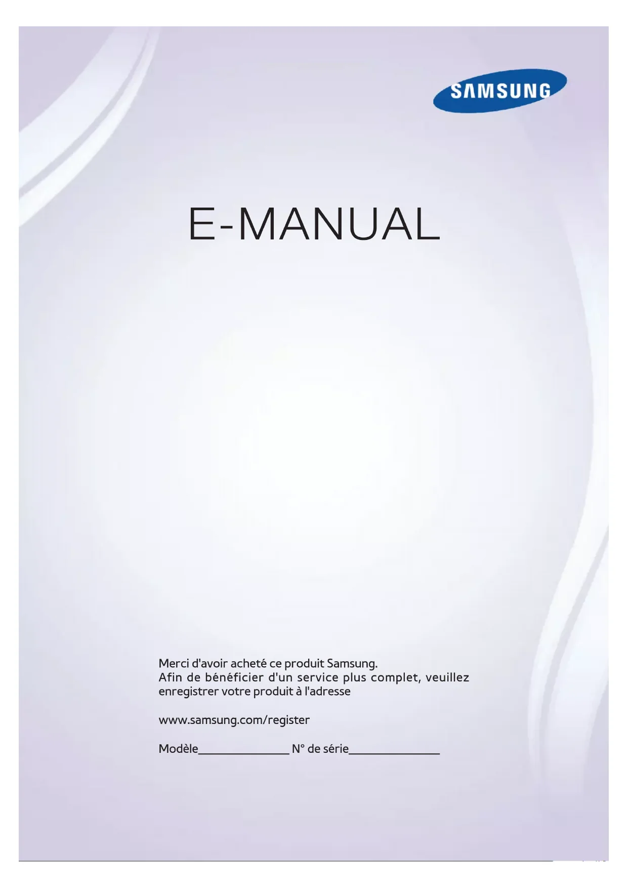 E-MANUAL Merci d'avoir acheté ce produit Samsung. Afin de bénéficier d'un service plus complet, veuillez enregistrer votre produit à l'adresse www.samsung.com/register Modèle______________ N° de série______________Contenu Guide e-Manual Affichage de l'e-Manual 1 Défilement d'une page 1 Utilisation des icônes principales 1 Retour à la page d'accueil1 Recherche dans l'index2 Recherche de pages2 Fermeture du manuel électronique 2 Accès à une option de menu 2 Mise à jour de l'e-Manual Connexions Connexion avec antenne Connexions de périphériques vidéo 5 Connexion HDMI 6 Connexion Composant 6 Connexion AV 7 Connexion SCART (Péritel) Connexions aux périphériques audio 8 Connexion audio numérique (Optique) 9 ARC (canal de retour audio) Connexion d'un casque Connexion d'un ordinateur 10 Connexion HDMI 11 Connexion HDMI vers DVI Mise en route Basculement entre différentes sources vidéo Programmation 13 Recherche automatique Paramètres chaînes 14 Pays (zone) 15 Recherche manuelle 15 Lorsque l'option Aerial Source est réglée sur Air ou Cable 16 Transf. liste chaînes 16 Supprimer profil opérateur CAM 17 Système satellite 19 Recherche de chaînes satellites Gestion des chaînes 22 Suppression de chaînes 22 Modification d'un numéro 22 Verr. chaîne 22 Déverrouillage de chaîne 22 Modification du nom de chaînes analogiques Interface commune Options audio Chaînes favorites 25 Ajout de chaînes 25 Suppression de chaînes 26 Réorganisation d'une liste de chaînes favorites 26 Modification du nom d'une liste de chaînes favorites 26 Copie d'une liste de chaînes favorites Paramètres réseau Configuration du réseau 27 Réseau câblé 28 Réseau sans fil 28 Série LED 530029 Précautions relatives aux réseaux sans fil29 Série LED 530029 Protocoles de sécurité de réseau Configuration Internet 30 Configuration automatique du réseau câblé 31 Configuration manuelle de réseau câblé 33 Echec de connexion filaire Configuration du réseau sans fil 34 Configuration automatique du réseau sans fil 35 Configuration manuelle du réseau sans fil 37 Bouton WPS 37 Echec de connexion sans fil 38 Adresses IP dynamiques ou statiques Vérification de l'état du réseau 40 Wi-Fi Direct 40 Paramètres AllShare II40 Renommer le téléviseur Commande du téléviseur Smart Touch Control 41 Insertion des piles (AAA x 2) 41 Connexion au téléviseur 42 Reconnexion du Smart Touch Control 42 Alarme de batterie faible 43 Boutons et descriptions 45 Fonctions spécifiques Touch Pad 46 Faire glisser 46 Appuyez sur 47 Mouvement rapide 47 Maintenez appuyé 47 Appuyez et déplacez 48 Défilement haut/bas 48 Défilement gauche/droite 49 Changement de chaîne par la saisie de chiffres 49 Guide de saisie numérique 49 Réglage du Touch Pad 49 Affichage du bandeau d'état et de notification 50 Recommandations 50 Historique 50 Supprimer des données de l'historique 50 Recherche Utilisation de la télécommande virtuelle 51 Modification du panneau de configuration de la télécommande virtuelle 51 Changer la position du panneau de la télécommande virtuelle 51 Utilisation du panneau numérique 51 Utilisation du panneau de configuration de la lecture 51 Utilisation du panneau d'accès rapide 51 Réglage de la télécommande virtuelle Config téléc universelle 52 Connexion du CABLE D'EXTENSION IR 52 Ajout du périphérique externe 53 Utilisation de la télécommande universelle 53 Gestion de périphérique externe enregistré Saisie de texte à l'aide du clavier à l'écran 54 Saisie de texte à l'aide du clavier QWERTY 54 Fonctionnalités supplémentaires Interaction intelligente Interaction INTELLIGENTE 55 Précautions 55 Reconnaissance faciale 55 Utilisation de la caméra TV 56 Commande par mouv. 56 Reconnaissance vocale Reconnaissance vocale 58 Environnement d'utilisation 58 Didacticiel reconnaissance vocale 58 Activation de Reconnaissance vocale 59 Utilisation de base de la Reconnaissance vocale 59 Paramètres de la Reconnaissance vocale 60 Commandes de Reconnaissance vocale interactive 60 Désactivation de la fonction Reconnaissance vocale Commande par mouv. 61 Environnement d'utilisation 62 Test environnement Commande par mouv. 62 Didacticiel sur la commande par mouvement 62 Activation de la commande par mouvements 63 Utilisation des commandes par mouvements de base 63 Options de commande par mouvements 64 Ecran Commande par mouv. 64 Composition de l'écran lorsque vous regardez la télévision 65 Composition de l'écran Smart Hub Reconnaissance faciale 67 Environnement d'utilisation 67 Gardez à l'esprit les informations suivantes lorsque vous utilisez la reconnaissance faciale : 68 Enregistrement du visage 68 Login par reconnaissance faciale Utilisation de dispositifs périphériques 69 Connexion d'un clavier 69 Utilisation du clavier 70 Connexion d'une souris 70 Utilisation d'une souris Visionnement du téléviseur Visionnement du téléviseur 71 Informations sur les programmes 71 Changement de signal de diffusion 71 Guide 71 Changement de chaîne 72 Enregistrement du programme en cours de diffusion 72 Changement de catégorie II III72 Quick Navigation 72 Programmer visionnage 72 Programmer enregistrement 72 Consultation des informations sur les programmes 73 Liste des chaînes 73 Changement de chaîne 73 Tri 74 Genre 74 Changement de signal de diffusion 74 Changement de liste des chaînes Programmer visionnage 75 Programmation du visionnage de chaîne numérique 75 Guide 75 Informations sur les programmes 76 Programmation du visionnage de chaîne analogique 76 Annulation d'un visionnage programmé 76 Modifier la liste des programmes Programmer enregistrement 77 Précautions 78 Configuration de périphérique d'enregistrement dédié 78 Plug & Play 79 Gestion de périphérique d'enregistrement dédié 79 Enregistrement de programmes 79 Guide 80 Informations sur les programmes 80 Heure et date spécifiées 80 Annulation de la fonction Programmer enregistrement 80 Modification de la liste de 