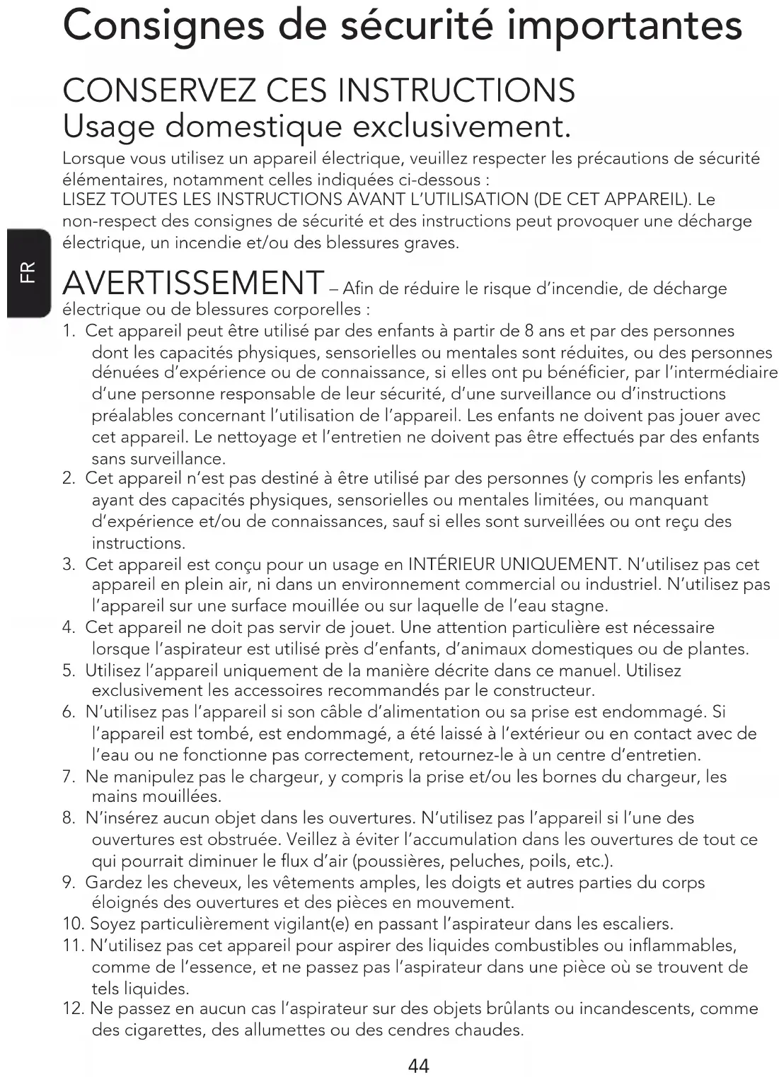 Usage domestique exclusivement. Lorsque vous utilisez un appareil électrique, veuillez respecter les précautions de sécurité élémentaires, notamment celles indiquées ci-dessous: LISEZ TOUTES LES INSTRUCTIONS AVANT L’UTILISATION (DE CET APPAREIL). Le non-respect des consignes de sécurité et des instructions peut provoquer une décharge électrique, un incendie et/ou des blessures graves. AVERTISSEMENT – An de réduire le risque d’incendie, de décharge électrique ou de blessures corporelles: