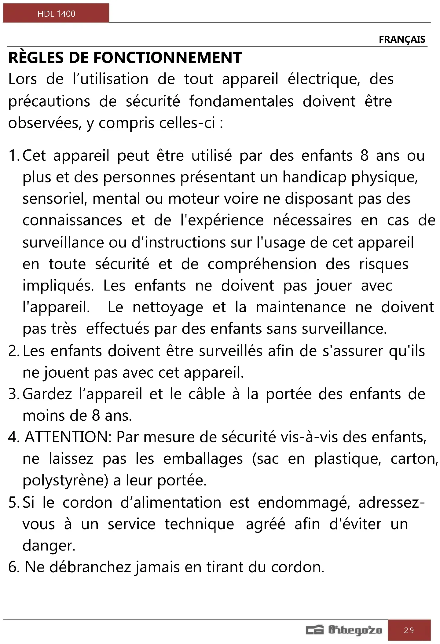 6. Ne débranchez jamais en tirant du cordon.HDL 1400