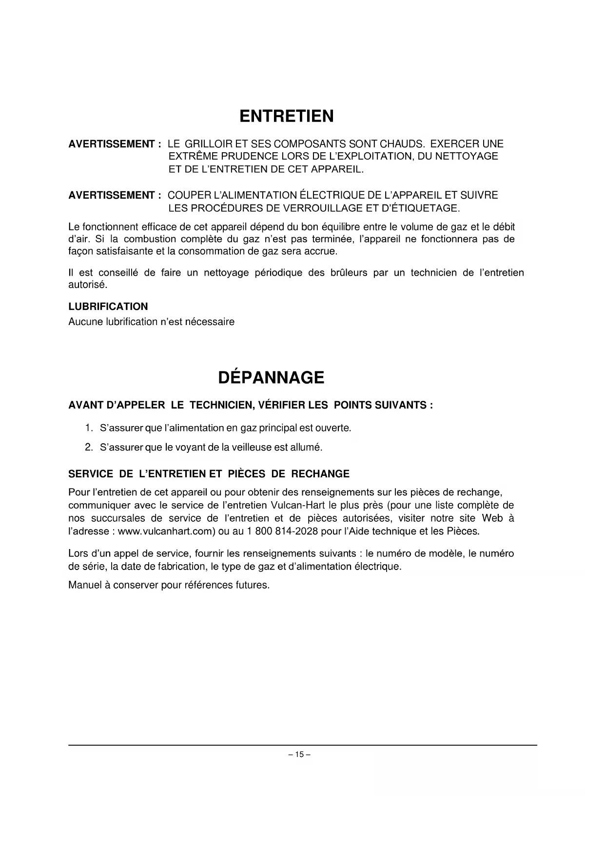 S’assurer que l’alimentation en gaz principal est ouverte. S’assurer que le voyant de la veilleuse est allumé. SERVICE DE L’ENTRETIEN ET PIÈCES DE RECHANGE Pour l’entretien de cet appareil ou pour obtenir des renseignements sur les pièces de rechange, communiquer avec le service de l’entretien Vulcan-Hart le plus près (pour une liste complète de nos succursales de service de l’entretien et de pièces autorisées, visiter notre site Web à l’adresse : www.vulcanhart.com) ou au 1 800 814-2028 pour l’Aide technique et les Pièces. Lors d’un appel de service, fournir les renseignements suivants : le numéro de modèle, le numéro de série, la date de fabrication, le type de gaz et d’alimentation électrique. Manuel à conserver pour références futures.– 14 –