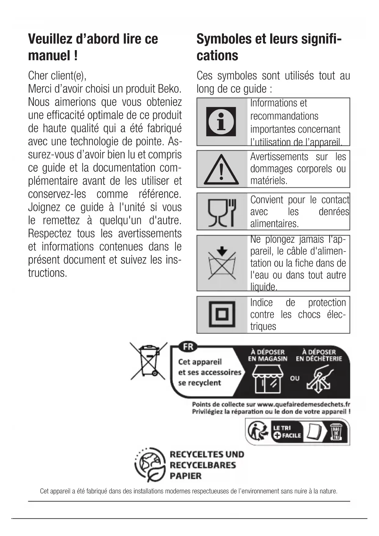 Diese Garantiezusage ist nur gültig innerhalb der Bundesrepublik Deutschland Garantiebedingungen - Beko – Version Februar 2021Veuillez d’abord lire ce manuel ! Cher client(e), Merci d’avoir choisi un produit Beko. Nous aimerions que vous obteniez une efficacité optimale de ce produit de haute qualité qui a été fabriqué avec une technologie de pointe. As- surez-vous d’avoir bien lu et compris ce guide et la documentation com- plémentaire avant de les utiliser et conservez-les comme référence. Joignez ce guide à l'unité si vous le remettez à quelqu'un d'autre. Respectez tous les avertissements et informations contenues dans le présent document et suivez les ins- tructions. Symboles et leurs signifi- cations Ces symboles sont utilisés tout au long de ce guide :