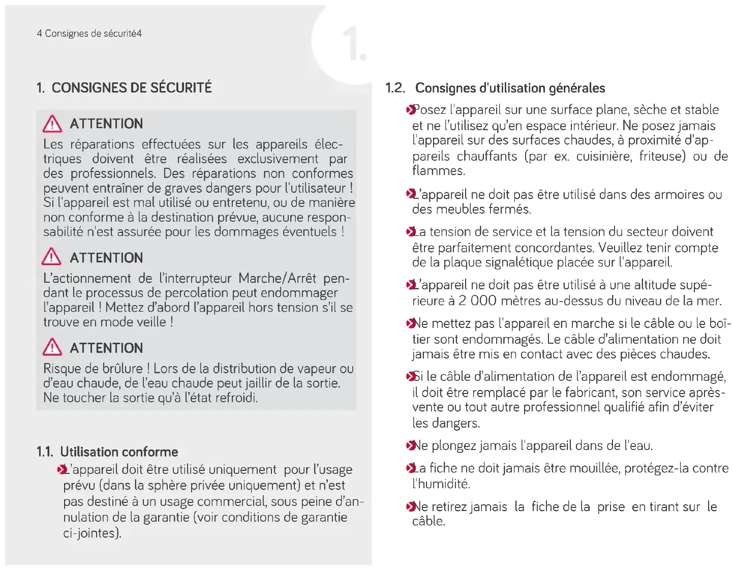 Ne retirez jamais la fiche de la prise en tirant sur le câble. ATTENTION Les réparations effectuées sur les appareils élec- triques doivent être réalisées exclusivement par des professionnels. Des réparations non conformes peuvent entraîner de graves dangers pour l'utilisateur! Si l'appareil est mal utilisé ou entretenu, ou de manière non conforme à la destination prévue, aucune respon- sabilité n'est assurée pour les dommages éventuels! ATTENTION L’actionnement de l’interrupteur Marche/Arrêt pen- dant le processus de percolation peut endommager l’appareil! Mettez d’abord l’appareil hors tension s’il se trouve en mode veille! ATTENTION Risque de brûlure! Lors de la distribution de vapeur ou d’eau chaude, de l’eau chaude peut jaillir de la sortie. Ne toucher la sortie qu’à l’état refroidi.Consignes de sécurité 5