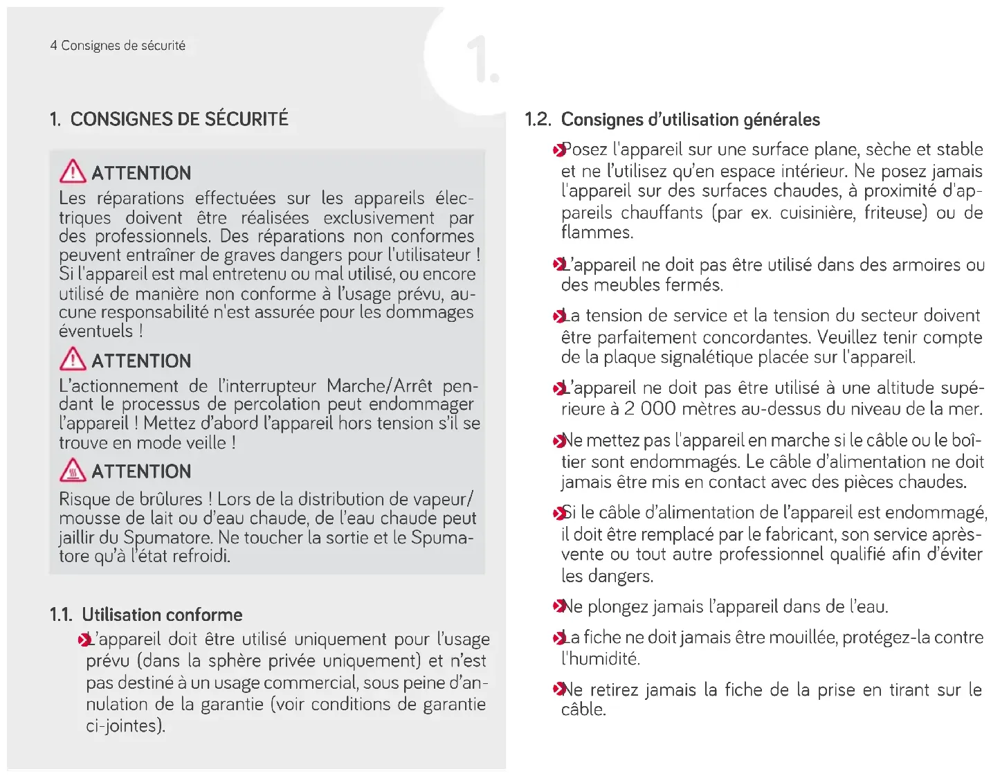 Ne retirez jamais la fiche de la prise en tirant sur le câble. ATTENTION Les réparations effectuées sur les appareils élec- triques doivent être réalisées exclusivement par des professionnels. Des réparations non conformes peuvent entraîner de graves dangers pour l'utilisateur! Si l'appareil est mal entretenu ou mal utilisé, ou encore utilisé de manière non conforme à l’usage prévu, au- cune responsabilité n'est assurée pour les dommages éventuels! ATTENTION L’actionnement de l’interrupteur Marche/Arrêt pen- dant le processus de percolation peut endommager l’appareil! Mettez d’abord l’appareil hors tension s’il se trouve en mode veille! ATTENTION Risque de brûlures! Lors de la distribution de vapeur/ mousse de lait ou d’eau chaude, de l’eau chaude peut jaillir du Spumatore. Ne toucher la sortie et le Spuma- tore qu’à l’état refroidi.5Consignes de sécurité